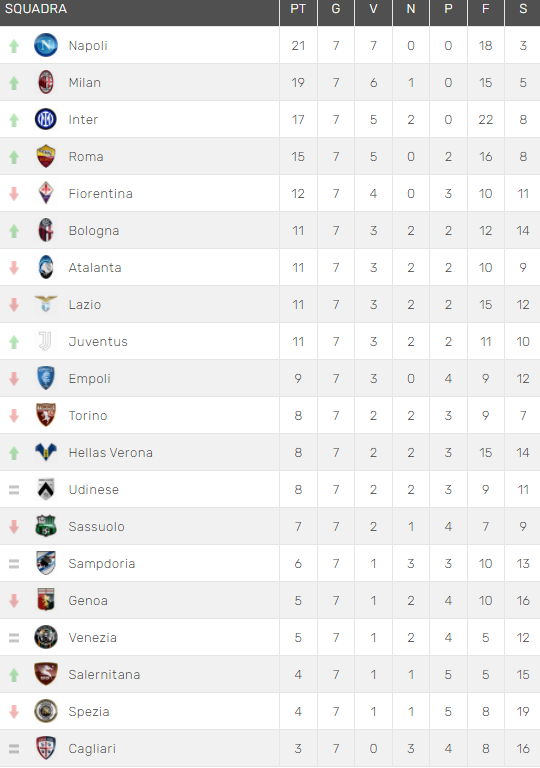 Il Napoli rimane capolista a punteggio pieno con sette vittorie su sette partite giocate mentre arriva la prima vittoria della Salernitana, di misura sul Genoa. Questi i risultati e la classifica dopo la 7° giornata di Serie A: