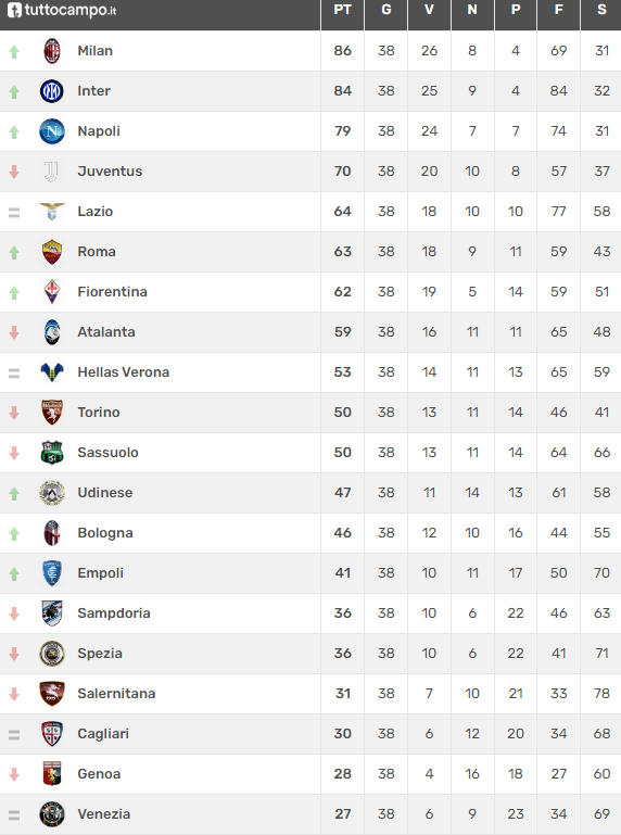 Si è giocata la 38a e ultima giornata del campionato di Serie A. Il Milan si è laureato campione d’Italia dopo 11 anni grazie al netto successo ottenuto a Reggio Emilia contro il Sassuolo. Non serve all’Inter la vittoria sulla Sampdoria che così resta al secondo posto a due lunghezze di distanza. Clamoroso epilogo nella lotta salvezza; la Salernitana sbaglia completamente partita e viene travolta in casa dall’Udinese per 4-0 ma il Cagliari non va oltre il pareggio in quel di Venezia e così i campani, incredibilmente, rimangono in Serie A. Appuntamento alla prossima stagione, con il via del campionato prima di ferragosto.