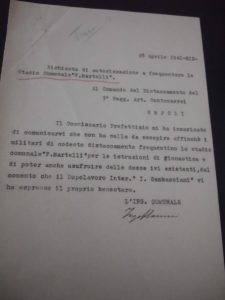 Per quanto riguarda gli altri lavori c’è una lettera dell’Ing. Torrini, del 19.06.1937 nella quale il capo dell’UT scrive al Sindaco sollecitandolo ad un aumento delle somme disponibili per ultimare i lavori sul campo. L’Ingegnere segnala che, affinché il campo possa dirsi definitivamente ultimato, mancano i lavori consistenti “….nella costruzione del passaggio in cemento armato per il giuocatori, nella sistemazione con polvere di laterizio della pista, nella costruzione stabile della linea elettrica e nella sistemazione e costruzione di tutti i giuochi per l’atletica leggera nonché nella costruzione di un campo da tennis”.