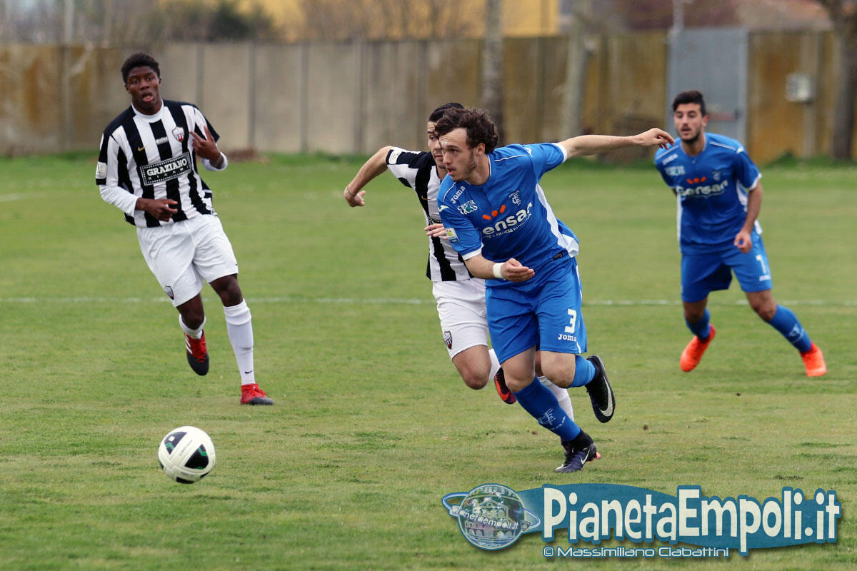 16′: palla lunga in area empolese, Giampè manca il tempo dell’intervento, sulla palla si getta Vendola, esce Giacomel e manda in angolo, l’Asscoli reclama il rigore; da rivedere