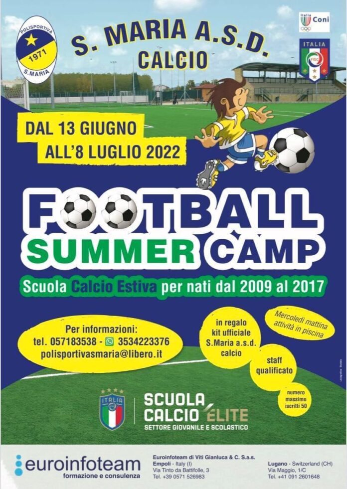 Come dalla locandina la Pol. S. Maria A.S.D. organizza dal 13 giugno prossimo, presso il proprio Centro Sportivo, la SCUOLA CALCIO ESTIVA per i bambini nati negli anni dal 2009 al 2017.