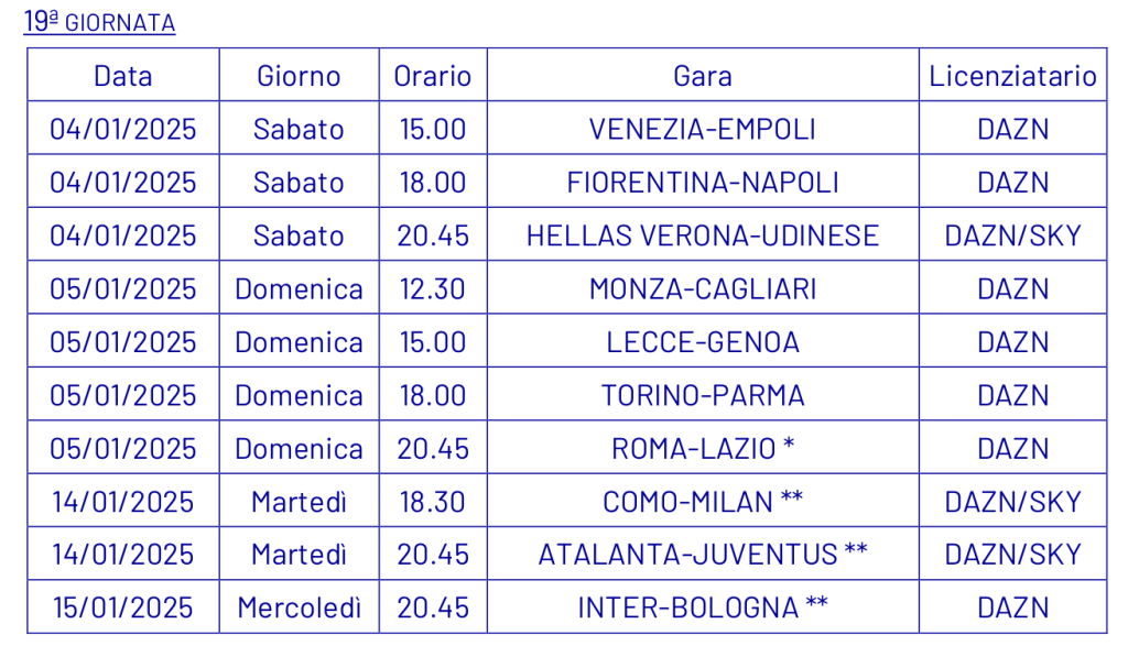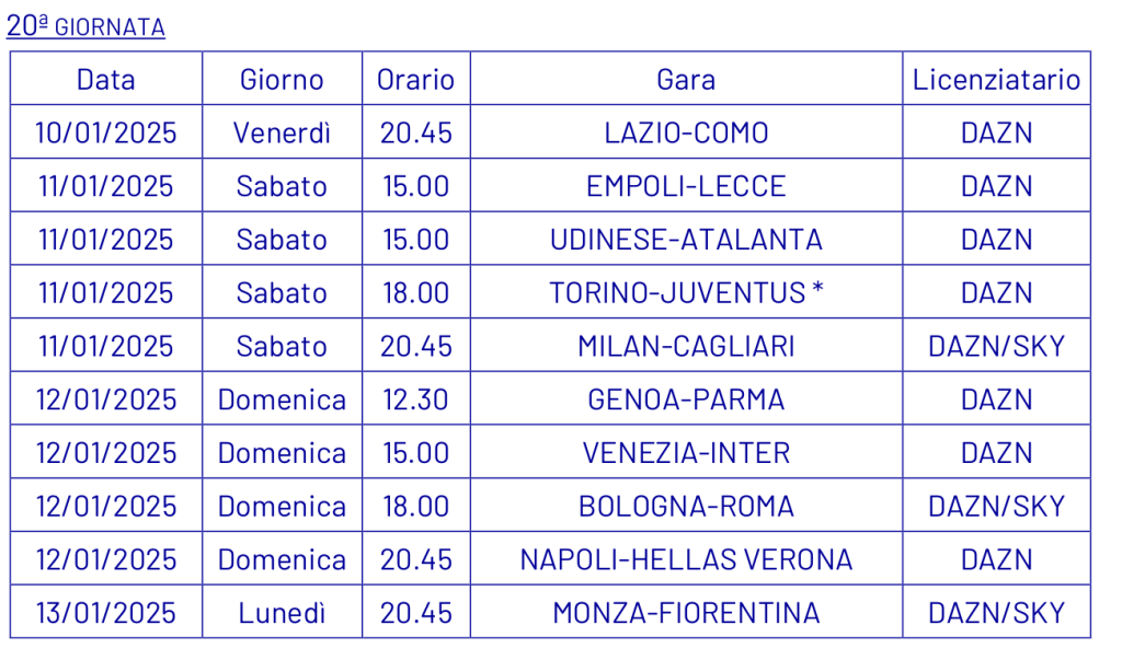 Home Empoli Anticipi & Posticipi delle prime due gare del 2025 Anticipi & Posticipi delle prime due gare del 2025 Di Tommaso Chelli - 1 Novembre 2024 3 La Lega Serie A ha reso nota la programmazione della diciannovesima e della ventesima giornata di Serie A Enilive, le prime due giornate del 2025: Questo il programma completo: ARTICOLI CORRELATIALTRO DALL'AUTORE Empoli Joseph Ceesay: “Siamo in fiducia. Quella di domenica sarà una bella sfida” Empoli News dal campo Empoli Serie B, termina in parità Juve Stabia-Bari 3 Commenti Ottimo orario per la trasferta di Venezia il prox. Sabato 4/1 😉👕 Risposta Il sabato alle 3 d’inverno va bene Risposta Per befana siamo disoccupati Risposta LASCIA UN COMMENTO Cancella la risposta Please enter your comment! Please enter your name here You have entered an incorrect email address! Please enter your email address here Save my name, email, and website in this browser for the next time I comment. Δ Le ultime fotogallery Empoli Galleria Serie B 2025/26 | Empoli – Bari Massimiliano Ciabattini - 29 Novembre 2025 2 Galleria Serie B 2025/26 | Avellino – Empoli 23 Novembre 2025 Galleria Serie B 2025/26 | Empoli – Catanzaro 8 Novembre 2025 Galleria Serie B 2025/26 | Virtus Entella – Empoli 1 Novembre 2025 Galleria Serie B 2025/26 | Empoli – Sampdoria 28 Ottobre 2025