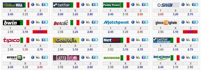 Vediamo tutte le quotazioni 1X2 per la partita in oggetto (cliccare sopra per ingrandire):
