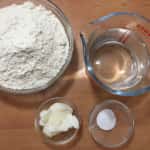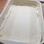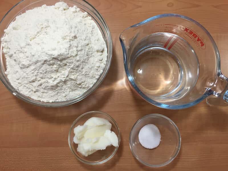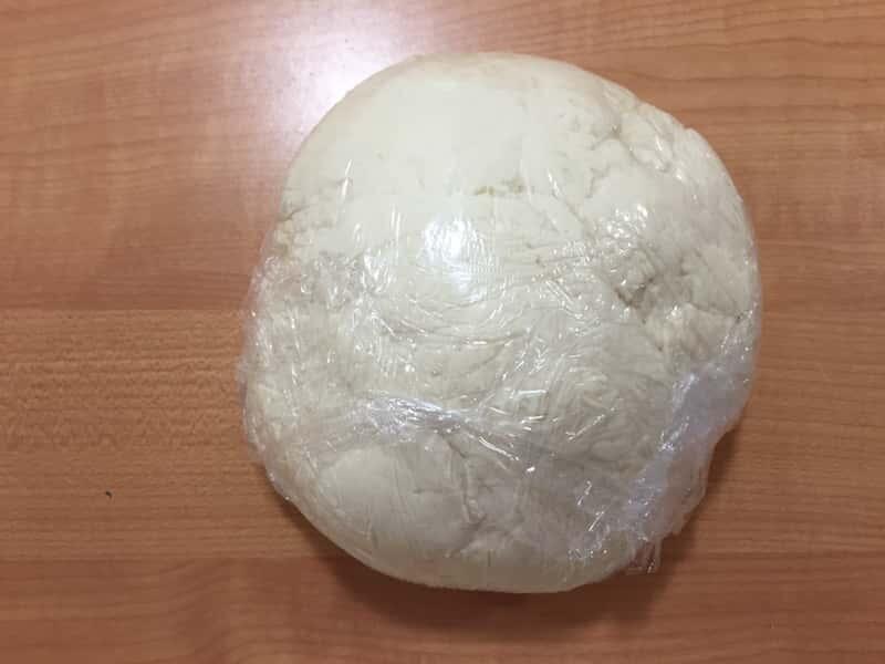 Preparate per prima la pasta unendo farina, strutto e sale su una spianatoia (foto 1), o nella planetaria con il gancio, aggiungendo poco alla volta l’acqua fino a raggiungere una consistenza liscia e non appiccicosa. Lavoratela bene fino a formare una palla, avvolgetela nella pellicola (foto 2) e mettetela a riposare in frigorifero per almeno 1 ora.
