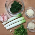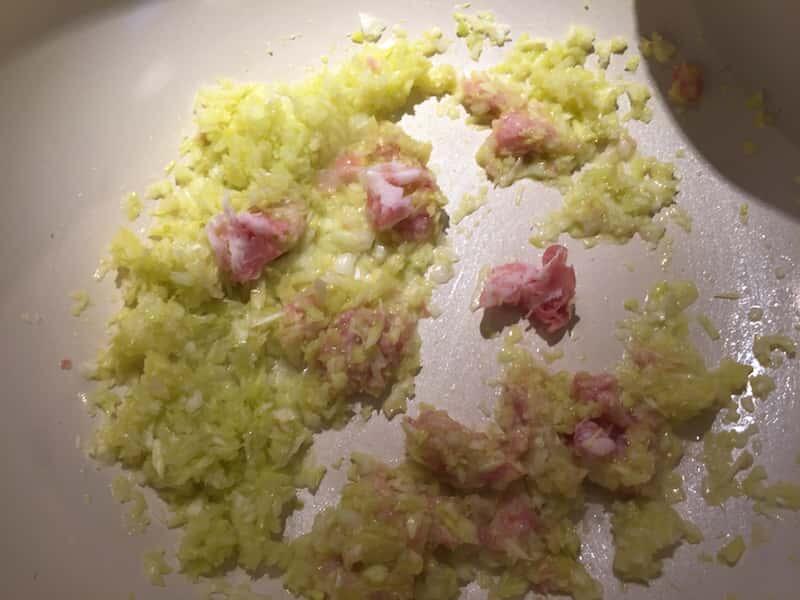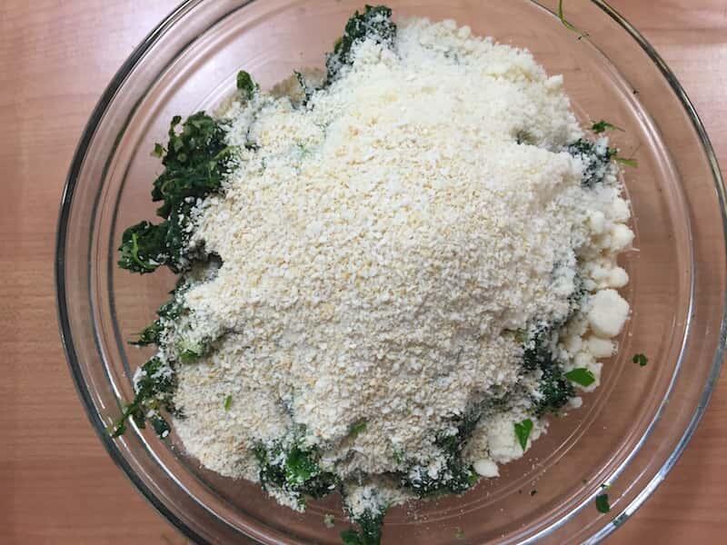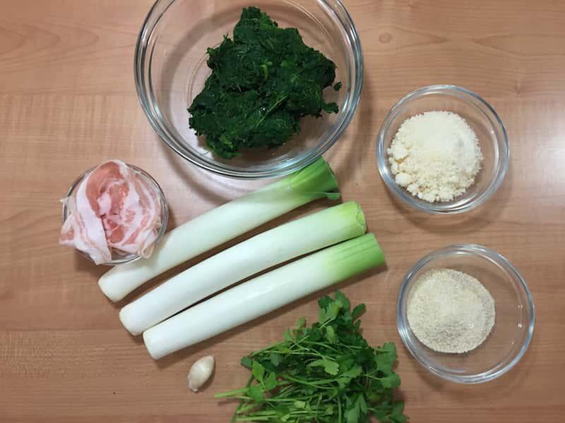 Passate in padella la pancetta tritata insieme all’olio, ai porri tritati e all’aglio schiacciato (foto 3-4). Una volta appassiti aggiungete gli spinaci, regolate di sale e pepe e lasciate insaporire per qualche minuto. Togliete dal fuoco e lasciate raffreddare, quindi aggiungete il prezzemolo tritato, il pangrattato e abbondante parmigiano (foto 5).