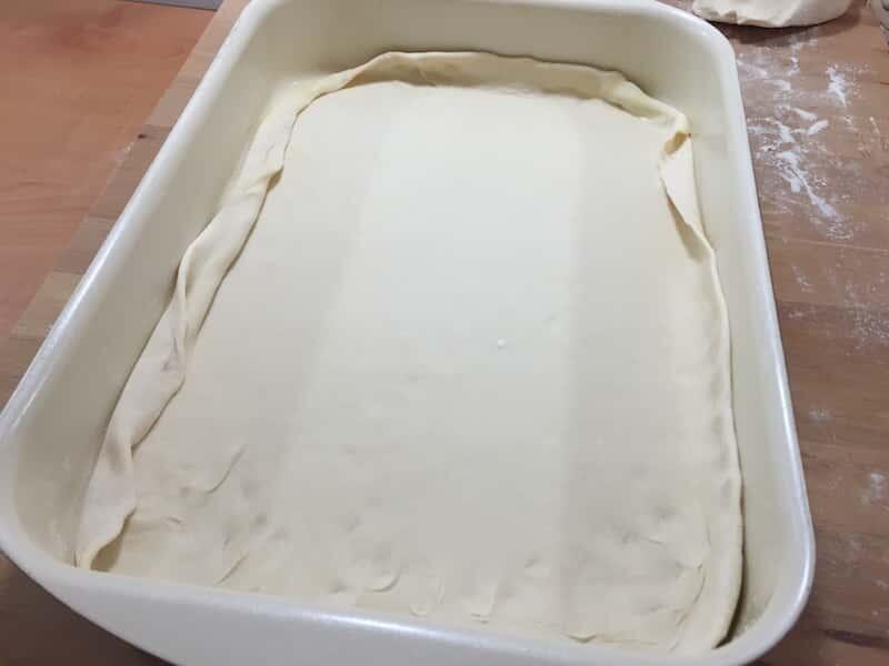 Dividete in due parti la pasta. Stendetene una prima parte sottilmente con il mattarello. Ungete una teglia con olio, rivestitela con la pasta (foto 6) e riempitela con il ripieno di spinaci (foto 7). Stendete l’altra parte di pasta tirata un po’ più sottile e riuchiudete il tutto, lasciandola un po’ increspata, pinzettata qua e là e sui bordi. Bucate la pasta con i rebbi di una forchetta (foto 8) e infornate a 180° per circa mezz’ora.