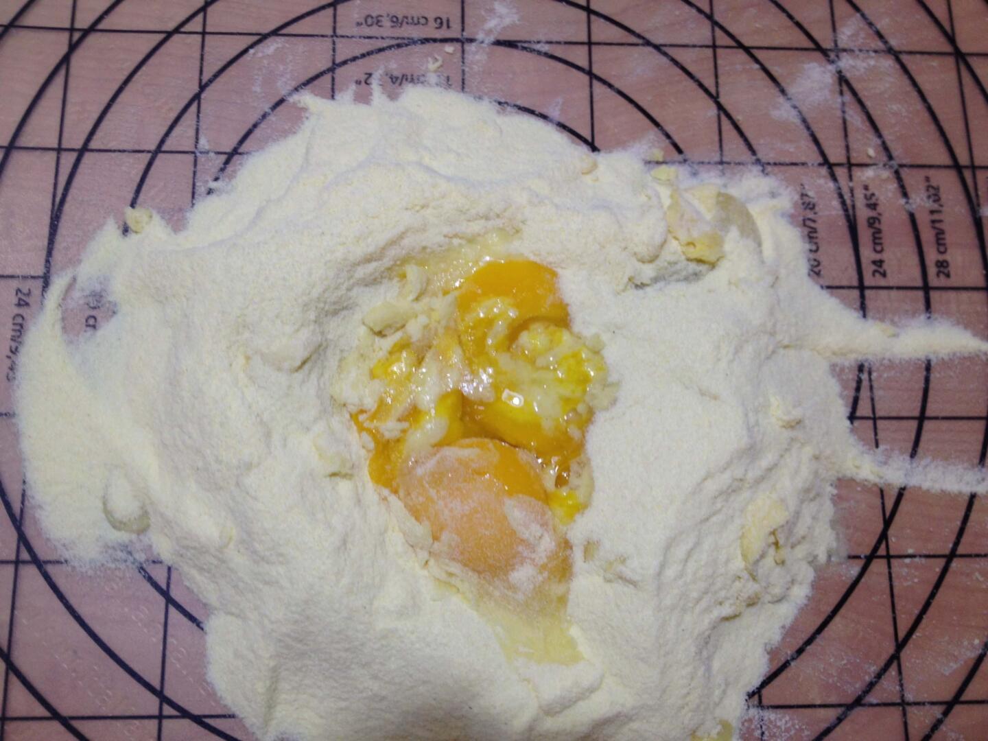Iniziate dalla pasta. Disponete la farina a fontana sulla spianatoia, versate al centro le uova e l’acqua (foto 1), sbattetele con la forchetta, e poi impastate fino a ottenere un composto liscio e omogeneo. Se avere un impastatrice mettete tutti gli ingredienti e fate impastare con il gancio. Formate una palla e  lasciate riposare almeno un’ora.