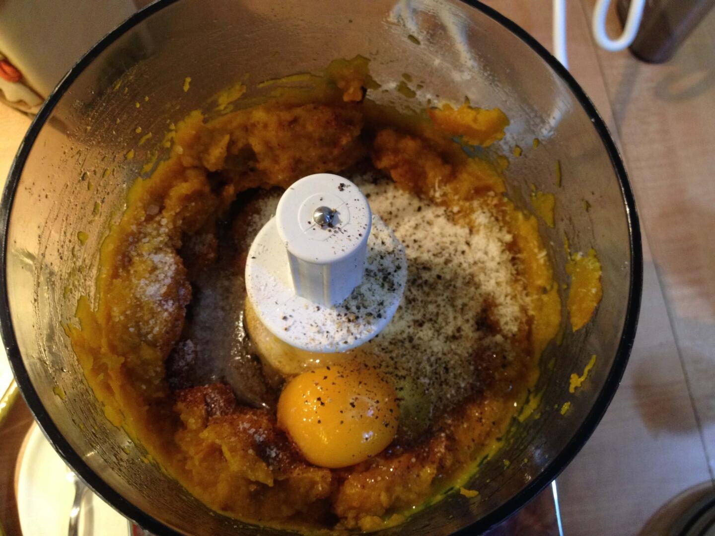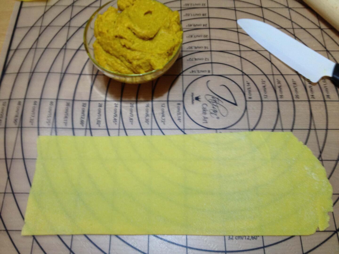 Pulite la zucca, tagliatela a pezzetti e fatela ammorbidire nel forno per circa 20 minuti (foto 2). Quando sarà ben ammorbidita mettere nel mixer con il parmigiano, l’uovo, il sale, il pepe e la noce moscata (foto 3), amalgamare bene il tutto in modo da ottenere un ripieno omogeneo e ben mescolato (foto 4), se risultasse liquido aggiungete del pangrattato.