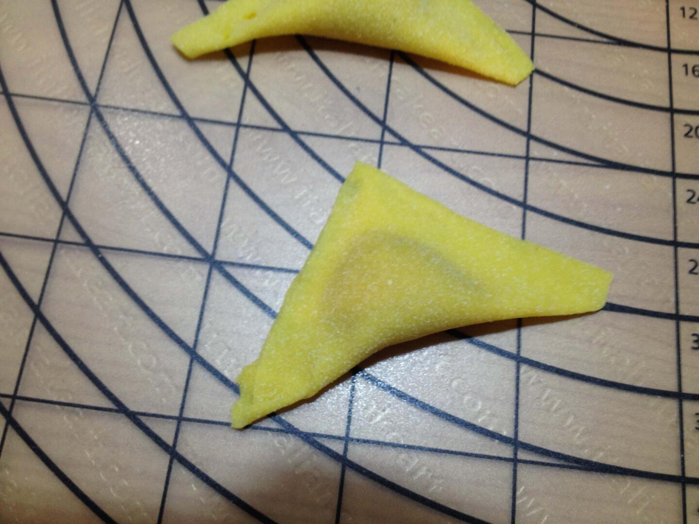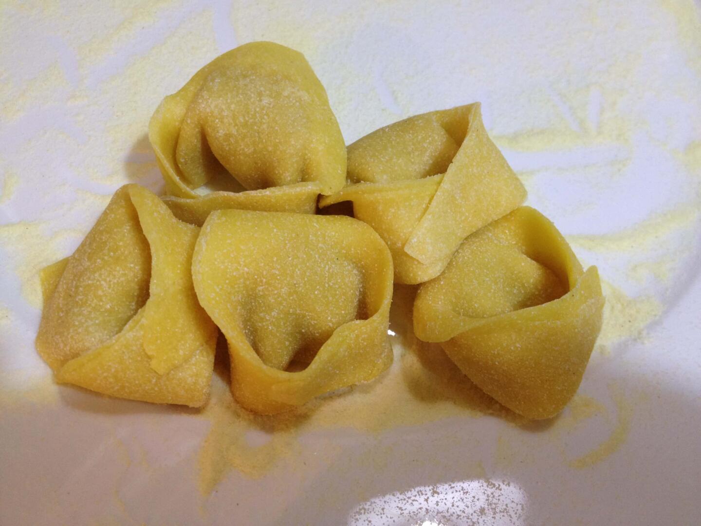 Tirate la sfoglia fine, deve risultare trasparente (foto 5 – 6). Ritagliate dei quadrati che abbiano il lato di 4-5 cm utilizzando una rotellina tagliapasta e disponete al centro di ciascuno un cucchiaino di ripieno (foto 7), chiudete la pasta a triangolo per realizzare i cappellacci (foto 8), premendo lungo gli orli per saldarla, quindi ripiegatela a tortello e fate in modo che i bordi aderiscano bene per tenere chiusi i cappellacci (foto 9). Fateli riposare su una superficie infarinata fino al momento della cottura in modo che non si attacchino.