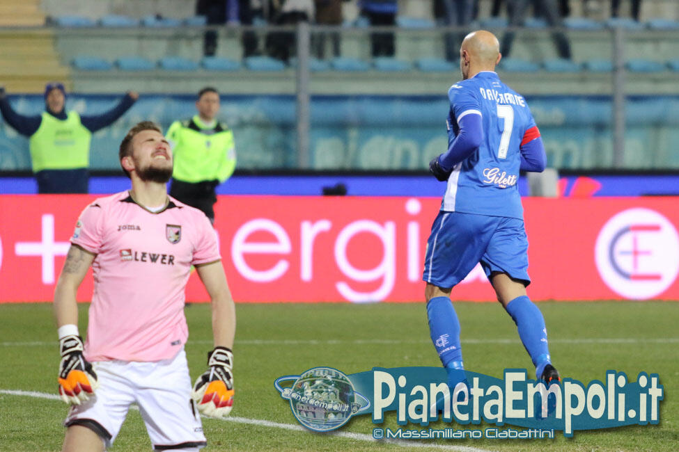 Dopo la battuta d’arresto in terra bergamasca l’Empoli riprende la propria corsa e lo fa nel migliore dei modi, aggiudicandosi lo scontro diretto con il Palermo e mettendo altri 3 punti fra sè e i rosanero. Gara non bella, che ha palesato tutti i limiti di due squadre che non a caso lottano per la salvezza. Nel primo tempo fanno vedere qualcosa in più gli azzurri, caricati da un ambiente che sentiva molto l’importanza della gara, ma senza riuscire a dare concretezza alle proprie sortite offensive. La ripresa si apre sulla medesima falsariga, con sortitre offensive piuttosto episodiche da parte di entrambe le compagini che danno l’impressione di accontentarsi del pareggio. Chi non si accontenta però è Massimo Maccarone che, subentrato a Marilugo al 30′ della ripresa, impiega due minuti a procurarsi e realizzare il rigore che decide l’incontro e porta alla propria squadra una vittoria fondamentale in ottica campionato. A seguire il tabellino e la gallery con le foto del match.