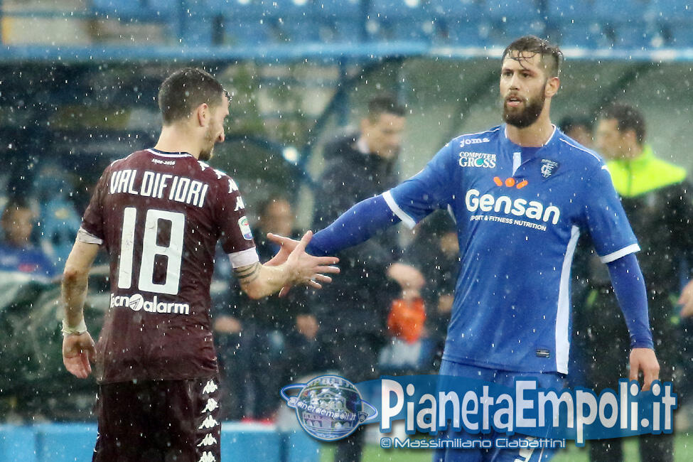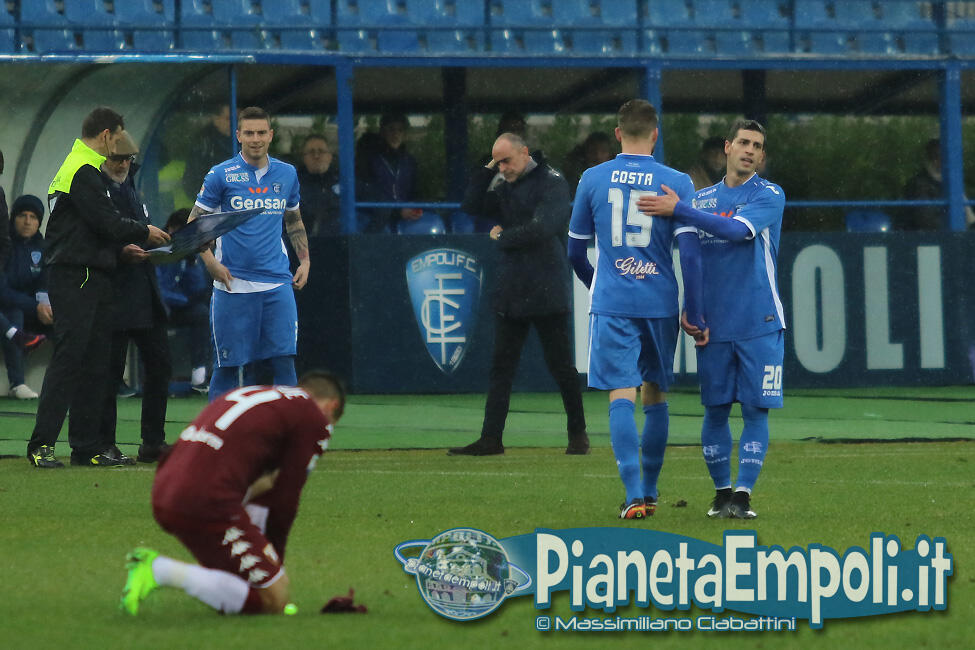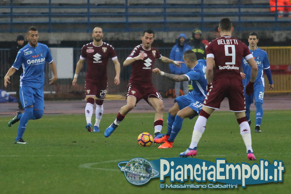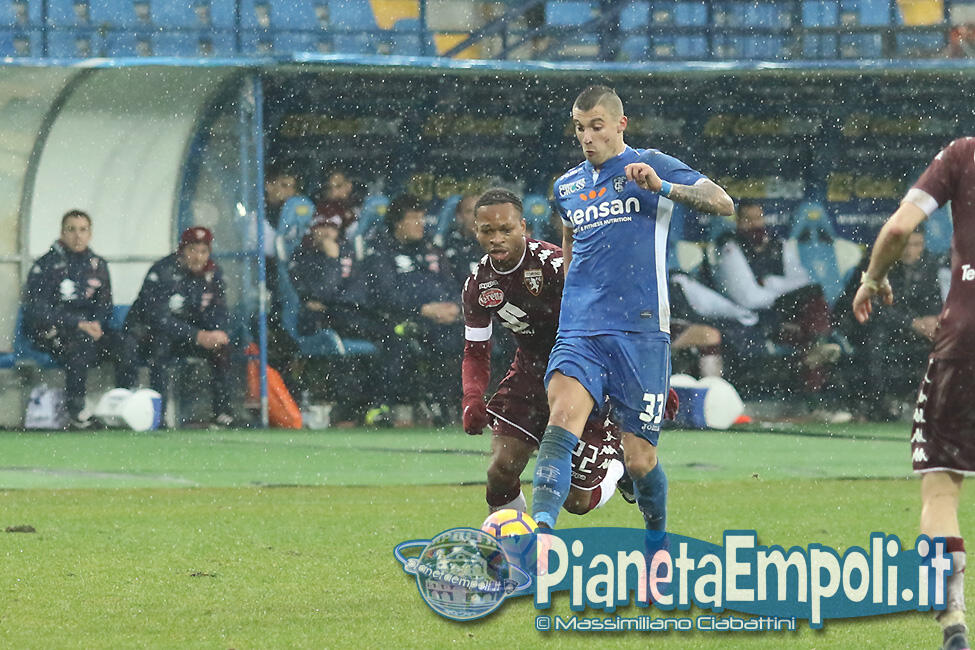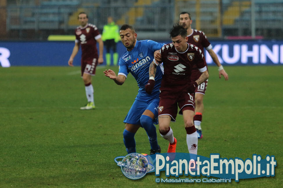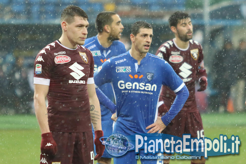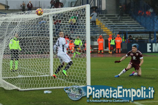 Con carattere e determinazione l’Empoli si rimette in carreggiata dopo la sconfitta di Crotone, riacciuffando una gara cominciata nel peggiore dei modi con la rete degli ospiti dopo appena 10′: sul filo del fuorigioco Belotti raccoglie al volo un cross dalla sinistra e insacca imparabilmente sotto la traversa della porta di Skorupski. Gli azzurri non perdono però la testa e cercano con caparbietà il goal del pareggio, sfiorandolo prima con un’eccezionale rovesciata in area di Mchedlidze che lambisce il palo alla destra di Hart, e trovandolo poi con Pucciarelli rapace nell’avventarsi su un retropassaggio della difesa granata rallentato dal campo impregnato di acqua per la copiosa pioggia di oggi. La ripresa si apre con il Torino lanciato in avanti alla ricerca del goal vittoria, che potrebbe trovare su rigore con Iago Falque se il solito immenso Skorupski non si opponesse alla sua conclusione dal dischetto. Le condizioni del terreno del Castellani peggiorano col passare dei minuti e ciò non contribuisce certo al gioco espresso dalle due compagini, che entrambe peccano di precisione al momento di arrivare alla conclusione in area. Il match scivola via così verso un pareggio che in fin dei conti rispecchia l’equilibrio visto in campo, dove di fatto nessuna delle due squadre ha mostrato una netta superiorità sull’altra. A seguire gallery e tabellino del match.