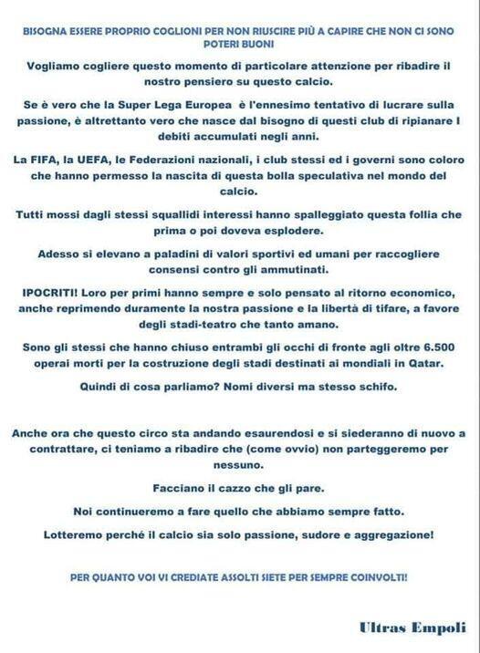 I supporter azzurri sottolineano che l’idea della creazione di una Super Lega, sebbene sia l’ennesimo tentativo di lucrare sulla passione dei tifosi, è nata per ripianare i debiti. E che la responsabilità di questa situazione di “bolla speculativa” sia da attribuirsi non solo ai club, ma anche a FIFA, UEFA, Federazioni internazionali e governi. La tifoseria azzurra decide quindi di non schierarsi e di non parteggiare per nessuno.