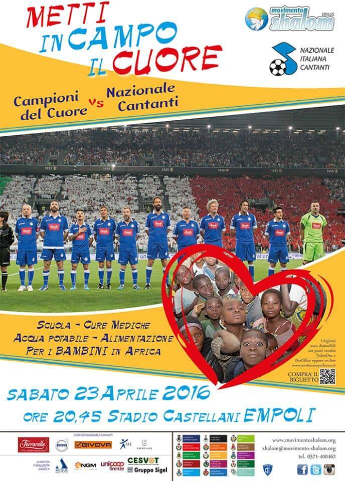 Tutti coloro che acquisteranno un biglietto di CURVA NORD per la gara Empoli-Fiorentina riceveranno un biglietto, dello stesso settore per “Metti in campo il cuore“, la partita di beneficenza che si terrà sabato 23 aprile 2016 presso lo Stadio Castellani di Empoli e vedrà di fronte i cantanti della “Nazionale Italiana Cantanti” e i “Campioni del cuore“