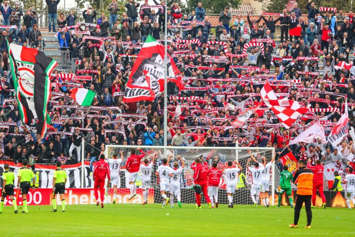 proseguono in città, dove la tifoseria raggiunge il centro in corteo con a capo lo striscione “GiochiamocelA qua”, per attendere la squadra. All’arrivo della squadra a bordo di un pullman scoperto vengono accese torce e fuochi artificiali e la festa continua fino a notte fonda. -Lodevole iniziativa degli ultras carpigiani in trasferta a Lanciano nel marzo 2015, quando mostrarono la frase “Venerdì ore 19: che Skyfo”, con ogni tifoso con un televisore di cartone disegnato in mano e la faccia dentro lo schermo. Esposta inoltre la scritta “’Sangue lacrime e gloria’ R.I.P. Matteo”, un ultrà non più tra noi. -Col Modena in casa coreografia abbastanza ben riuscita, nel dicembre 2014: fumogenata con la scritta rispolverata “Carpi da sempre senza provincia” e lo stendardo “Carpi provincia di…Carpi”. -Esposto lo striscione in Carpi-Livorno del gennaio ‘15 “Cico un errore non cancella la tua storia biancorossa”, riferito a Fabio Concas, pescato positivo al controllo dell’antidoping e squalificato. -In Pescara-Carpi del 30 novembre 2013, esposti gli striscioni “Finalmente Away con voi” e “Grazie CFC” (Carpi Football Club). Il problema principale negli anni scorsi a Carpi, ricca città di quasi 71.000 abitanti, era quello della scarsa affluenza di pubblico, vista la vicinanza di città come Bologna, Modena (20 Km.) e Reggio Emilia; con la militanza della squadra in categorie minori in passato e il fatto che praticamente non esiste alcuna sezione ultrà al di fuori di Carpi, spesso il pubblico carpigiano si è dimostrato, almeno in passato, piuttosto freddo e distaccato nei confronti della squadra, e i ragazzi preferivano passare la domenica pomeriggio altrove anziché allo stadio. Ma il Carpi degli “immortali” ha inevitabilmente e naturalmente portato nuova linfa ed entusiasmo all’ambiente, anche se forse si potrebbe fare di più. -Sempre presenti le pezze “Mai per moda solo per amore” e “Assurdo pensar di batterci”.
