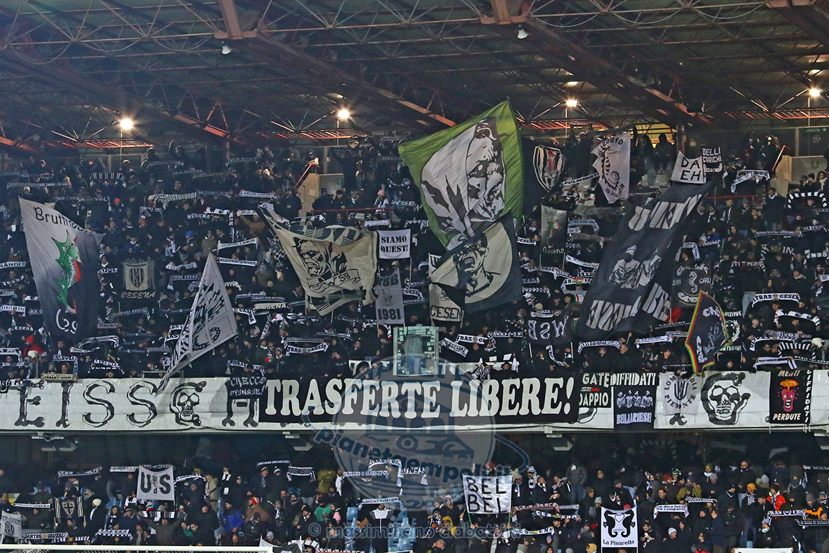 Curiosità: -Nella mattinata del 12 febbraio 2026 la Curva Nord del Brescia ha ufficializzato con un post sui social l’interruzione del gemellaggio con la curva cesenate: “La Curva Nord Brescia comunica con dispiacere l’interruzione del gemellaggio con la Curva Mare di Cesena per divergenze incolmabili tra i due direttivi, sorte nell’ultimo periodo in merito ad un volantino firmato da quest’ultima. Le divergenze erano sorte a settembre, quando nella Fanzine distribuita in Curva Mare in occasione di Cesena-Virtus Entella, il direttivo bianconero aveva accusato, tra l’altro, le due tifoserie milanesi di “piagnistei” in merito alla black list legata all’inchiesta sulle infiltrazioni criminali nelle curve. Visto il fortissimo legame con la Curva Sud Milan, i tifosi bresciani della Curva Nord hanno scelto di schierarsi dalla parte dei rossoneri, mettendo fine ad un gemellaggio con il Cesena che durava da oltre 40 anni e consolidato nella stagione 1982/83, quando ultras del Cesena decisero di sostenere il Brescia durante una partita in Romagna, rafforzando il rapporto d’amicizia tra le curve. Il gemellaggio si è ulteriormente consolidato durante lo spareggio per non retrocedere in C1 nel 1989 contro l’Empoli, con i lombardi che occuparono la curva cesenate. Dalla Curva Mare filtra comunque la notizia che il legame con gli “Ultras Brescia 1911”, e con gli altri gruppi che dal 1999 non stanno più in curva Nord, e che al momento non seguono l’Union Brescia perché in polemica con la fusione con la Feralpisalò, sia ancora in vigore. -Il tifo a Cesena è viscerale, sanguigno, romagnolo, profondamente radicato nel tessuto sociale come dimostra la massiccia partecipazione allo stadio. E di questa identità il tifo si fa portatore, mettendo il legame con la propria terra a difesa di tutto: è così che il 27 maggio 2023, data dell’andata dei Quarti di finale Playoff per la promozione in Serie B, gli ultras disertano lo spareggio di Vicenza, rilasciando un comunicato ufficiale, vista l’alluvione che mette in ginocchio la Romagna tra il 2 e il 17 maggio, provocando 17 vittime e 10 miliardi di danni. Al ritorno dei Playoff, a Cesena, espongono lo striscione “Non molleremo mai…siam romagnoli!”. -Nel novembre 2023 anche la Toscana è stata colpita da una pesante alluvione, molto simile a quella che devastava la Romagna solo 6 mesi prima e, avendola vissuta sulla loro pelle, gli ultras romagnoli si mobilitano mettendo presto in piedi una raccolta fondi contro la Vis Pesaro, in collaborazione col “Centro Coordinamento” ed “Insieme per Cesena”, raccogliendo ben 8.000 €., donati con Bonifico bancario. -A distanza di neanche un anno e mezzo dalla tragica alluvione del maggio 2023, alcune zone della Romagna sono purtroppo tornate sotto acqua e fango. Nell’immediato si è “reagito” portando, sui territori colpiti, ciò che poteva servire. Poi prima della gara casalinga col Mantova del 29 settembre 2024, è stata organizzata una colletta in tutti i settori dello stadio, chiedendo la massima partecipazione per far arrivare un aiuto concreto a chi deve ancora fare i conti col fango. -Intorno a metà dicembre 2025 è stato effettuato il bonifico della somma raccolta col Mantova, ammontante a 4.728 €., donata all’Associazione Sportiva Dilettantistica Bagnocavallo per il rifacimento dei campi di Traversara, piccola frazione fortemente colpita da tali eventi. -In occasione delle festività natalizie del 2024, son stati consegnati ai bambini dell’associazione Grazia e Pace i giocattoli raccolti in collaborazione con l’associazione Santa Lucia Biancoblù di Brescia. Un piccolo gesto per strappare un sorriso ai meno fortunati. -Per l’ennesima volta, per Cesena-Pescara del 7 febbraio 2026, i tifosi romagnoli si ritrovano ad assistere ad un incontro senza la controparte. Per cui la “Mare” resta fuori in segno di protesta per i primi 15 minuti, ma una volta entrati in curva non espongono i loro classici striscioni ma il solo ed unico messaggio “Trasferte libere…per tutti!”. -Per obbligo di Tessera saltata la trasferta di La Spezia del 25 agosto 2024. Saltata poi anche quella di Pisa, perché l’Osservatorio ha disposto, oltre all’obbligo della Fidelity per i residenti in Emilia-Romagna, anche quello dei bresciani e per tutti i residenti in Lombardia. La cosa viene giustamente ritenuta assurda. Il 20 febbraio 2025, a poco più di 48 ore da Cremonese-Cesena arriva l’ufficialità del divieto di trasferta. -La goccia che fa traboccare il vaso è l’obbligo della Tessera del tifoso per Brescia-Cesena dell’8 marzo 2025. I cesenati al riguardo scrivono sul web: “Da liberi cittadini schifati da tutto ciò non staremo sicuramente a guardare il Palazzo che si diverte a distruggere l’ultima parte sana rimasta di un calcio malato schiavo di Pay-tv e vittima di continui abusi e scandali, ma, come da oltre 20 anni continueremo a combattere e a far sentire la nostra voce tramite ogni mezzo disponibile, comprese le vie legali”. Infatti hanno presentato ricorso insieme al Cesena Calcio. Il 1° marzo 2025 la Curva Mare con la Salernitana osserva 15 minuti di silenzio non appendendo gli storici striscioni in segno di protesta contro questo calcio. -Altra decisione sconcertante è il divieto imposto ai palermitani, visto i buonissimi rapporti tra le due tifoserie, per Cesena-Palermo del 4 maggio 2025. Stavolta si è deciso di non entrare e non esporre gli striscioni, dando un segnale forte a queste restrizioni. Ricordando i gesti dei fratelli bresciani, fuori con loro per tutta la partita, e dei cremonesi, che disertarono il tifo nel rispetto del divieto imposto ai bianconeri ai tempi. Nel settembre 2025 è stata la volta di Venezia a essere saltata visto che ci voleva la Fidelity anche lì. Sabato 27 settembre 2025, ancora col Palermo in casa, ennesimo provvedimento restrittivo: la “Mare” reagisce restando in silenzio per i primi 30 minuti di gioco co