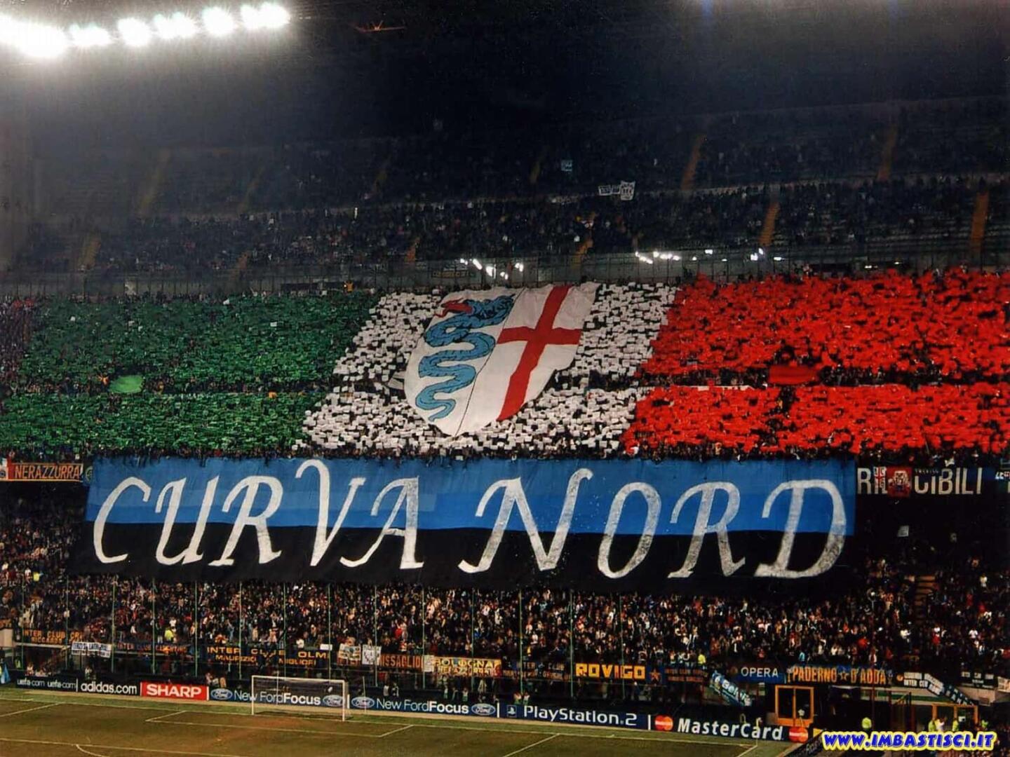 rotesta, mentre nello stadio, per tutta la durata della gara, veniva esposto senza autorizzazione lo striscione di 120 metri “Un derby senza libertà di colore…non merita neppure il calore”, diviso tra le due curve, separate nella fede ma unite nella rabbia contro il calcio moderno, l’ipocrisia dei poteri forti e l’ondata repressiva senza precedenti. -A distanza di poco tempo dalle esternazioni antiultras di Fabio Capello, nell’ottobre 2009, in Inter-Palermo, la Nord espone lo striscione “Capello: se in Italia comandassero gli ultras ci sarebbero leggi funzionali, prezzi popolari, stadi pieni…e l’Europeo 2012”, oltre a “Con famiglie che non riescono a fare la spesa avere gli stadi pieni è una bella pretesa!!! E’ colpa degli ultras?!?”. La Nord, al posto della solita coreografia, nella finale di Supercoppa interna con la Roma, dà sfogo alla sua rabbia con le parole, scritte su un telone copri curva: “Interisti, società, istituzioni: Scudetto, Coppa Italia e Coppa dei Campioni avrebbero meritato la coreografia più bella di sempre…il triste spettacolo di questa sera è il risultato del ricatto della tessera del tifoso che ci toglie il diritto di essere normali tifosi e la voglia di festeggiare!!! Lo spettacolo del calcio non merita questo schifo. Curva Nord (in attesa di rispetto “degno” di normali liberi cittadini)”. Nella gara interna con l’Udinese del 2010/11, la Nord, dopo aver raccolto adesioni per l’iniziativa “Una firma per Gabriele”, petizione indetta per apporre una targa alla memoria, sul luogo dove morì Gabriele Sandri, sciopera col tifo per i primi 20’, in segno di protesta verso chi sta rovinando il calcio e allontanando i tifosi dallo stadio, decidendo di esporre solo striscioni di contestazione, tra i quali “20 minuti di silenzio per ricordare il campionato di calcio vero con stadi pieni…quando i tifosi erano liberi cittadini che potevano scegliere come e quando andare allo stadio senza tessere, caro-biglietti e partite infrasettimanali” e “Anticostituzionalità, business e tanto fumo negli occhi alla gente: questa è la vera tessera del tifoso! Rivogliamo i nostri diritti”. All’ingresso dei giocatori in campo per Inter Werder Brema, fase a gironi di Champions League 2010/11, la Nord espone uno striscione, scritto in inglese, che tradotto in italiano significa “Il governo italiano sta svuotando gli stadi e uccidendo la passione della gente. Uefa: i tifosi italiani ti chiedono aiuto!”. Clamorosa poi la protesta per Inter-Verona dell’ottobre 2013 contro le norme su razzismo e discriminazione territoriale. Gli ultras nerazzurri per i primi 5’ rimangono seduti in silenzio lasciando le balconate spoglie dei loro striscioni, per poi esporre la scritta “Il progetto è chiaro: ci volete come non saremo mai…così, seduti e in silenzio…”; dopodiché vengono esposti in balconata “Ora però vi facciamo vedere quanto siete ridicoli con questa farsa della discriminazione territoriale”, per poi dividere in due il settore: da una parte si legge lo striscione “Questo si può”, cantando cori contro Milano, dall’altra viene esposto “Questo non si può”, intonando cori contro Napoli, per esporre infine “…E adesso quale parte di curva pensate di chiudere???” e “Il calcio è passione…i tifosi la sua anima…F.I.G.C. basta stupidi pretesti…se volete continuare a svuotare gli stadi, fatelo pure, ma senza menzogne”. -La trasferta sicuramente più triste e forse la più massiccia numericamente, con circa 45mila interisti presenti, è quella passata alla storia come la disfatta del 5 maggio 2002, ancora oggi ben impressa nelle menti degli sportivi italiani, nerazzurri e non (il coro di sfottò “5 maggio” ha accompagnato i tifosi bauscia in tutti questi anni un po’ ovunque), all’”Olimpico” di Roma coi gemellati laziali. Quando l’Inter, con una stadio pavesato a festa e pronto a festeggiare, dopo tredici anni di astinenza, lo scudetto tricolore, sbanda proprio all’ultima curva prima del traguardo, perdendo incredibilmente 4-2 con una Lazio che non aveva più niente da chiedere, sotto i colpi di Poborsky (2 gol), Simone Inzaghi e Simeone. Allo stesso tempo la Juventus vince a Udine 2-0, aggiudicandosi lo scudetto al fotofinish con 71 punti, e seconda arriva la Roma, vincente al “Delle Alpi” col punteggio di 1-0 contro il Toro, con 70 punti. Per l’Inter la beffa del terzo posto (69 punti), le lacrime di Ronaldo in panchina e, in pratica, di tutti i 75.333 spettatori (dato ufficiale), accorsi a sostenere l’Inter. -La curva Nord, contro il Livorno, nel novembre 2013, ringraziò Moratti dopo l’avvicendamento da presidente dell’Inter e il passaggio al nuovo proprietario Thohir, con il megastriscione “Le gioie più grandi, le sofferenze più imbarazzanti, 18 anni di gestioni racchiusi in quelle 12 domande…spesso l’abbiamo attaccata anche se mai l’abbiamo abbandonata…nonostante tutto qualcosa però ci accomuna…l’amore per l’Inter, innegabile…l’essere troppo tifoso che a volte è deleterio…ma intanto grazie di tutto presidente, se lo merita. In fondo le abbiamo voluto bene”. -Il 12 dicembre 2001 scompare all’età di 80 anni “l’altro Avvocato d’Italia”, quello caustico e dissacrante, Peppino Prisco, il dirigente per antonomasia, un simbolo, se non “il” simbolo dell’Inter, che ha sempre rappresentato, nei trionfi come nelle cadute, nei salotti televisivi, sempre pronto a difendere la sua squadra, soprattutto dagli attacchi dell’altra parte di Milano, quella rossonera e dei padroni del vapore calcistici. Vasta eco ebbe la sua morte nell’universo delle curve italiane, che gli tributarono solenne saluto con striscioni sinceri e affettuosi. Proverbiali le sue battute: “Un pronostico su Ascoli-Milan? Mi spiace deluderla, non seguo il calcio minore”, “Il momento più felice della mia vita? Vedere quelli lì in Serie B”. -Per Inter-Caglia