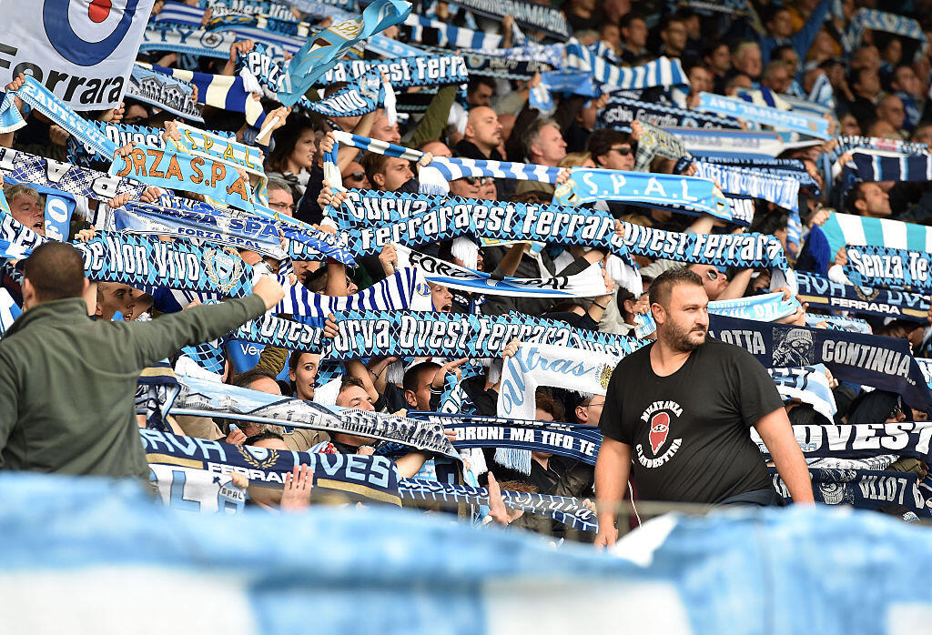 Rivalità: –Bologna: rivalità sentitissima, storica, acerrima. Circa 52 Km. separano Bologna da Ferrara, ma bastano per un odio quasi ininterrotto. In Bologna-Spal 93/94, anzi, in curva bolognese apparve lo striscione “Se odio significa rispetto, allora non fregiatevi del nostro”. Rubati in passato dai bolognesi gli striscioni “Spal=uragano”, “Gioventù Estense” e due “Spal Club”. –Padova: vecchio odio, acerrimo rancore. La rivalità era molto sentita, come del resto con tutte le città venete. Fondamentalmente era il Veneto a stare antipatico ai ferraresi. A Padova nell’86 circa 400 ferraresi fecero il diavolo a quattro e con inaudita sfrontatezza mostrarono, oltre allo striscione del neonato “Gruppo d’Azione”, “Figli di puttana” e “Ci fate schifo”. Al ritorno, a Ferrara, i padovani prima della gara, con lo stadio vuoto, riuscirono a prendere due importanti striscioni: “Gioventù Estense” e “Supporters”. L’incazzatura dell’intera curva ferrarese si riversò sulle strade: gravi violenze provocate dai teppisti locali vicino allo stadio e alla stazione. Padovani vengono intercettati da alcuni elementi del Gruppo d’Azione, aggrediti in corsa e derubati di sciarpe e qualche stendardo. Un’auto distrutta di tifosi veneti col conducente tirato giù per i capelli, e via guerrigliando…Rissa tra spallini e padovani nella stazione di servizio di Bentivoglio il 12 agosto 2018. 11 tifosi individuati e rinviati a giudizio. –Modena: tra le tifoserie di Ferrara e Modena vi fu rivalità estrema per tutti gli anni ’80 e ’90. Aree urbane delle due città diventavano campi di battaglie, gruppi di ragazzi si fronteggiavano in parcheggi, si scontravano agli incroci, in mezzo al traffico, scontri all’arma bianca lungo viali, volanti a sirene spiegate, imboscate, pestaggi, ambulanze intorno allo stadio. Nel 1983 i modenesi devastarono completamente un pullman di spallini. Le due città sono in qualche modo simili, non troppo, ma si ricordano a vicenda. Oltretutto entrambe “estensi”: Ferrara fu capitale degli Estensi per prima, poi, dopo circa 3 secoli, nel 1598, lo scettro passò a Modena. Modenesi odiati ma nello stesso tempo ammirati. –Lazio: identificati, perquisiti e sottoposti a Daspo 22 spallini e 9 laziali, protagonisti di uno scontro prima dell’amichevole disputata a Auronzo di Cadore, da anni sede del ritiro della Lazio, il 28 luglio 2018. Nella circostanza le due opposte fazioni si sono fronteggiate in una maxirissa nei pressi di un bar con ripetuti assalti a colpi di bastoni, cinghie, catene e altre armi improprie. Momenti di tensione dopo Spal-Lazio del 15 settembre 2019, quando uno sparuto gruppo di spallini cercano lo scontro con tifosi laziali. 4 ferraresi, denunciati dalla polizia avrebbero lanciato, lungo l’arteria che porta più velocemente ai caselli autostradali, bicchieri pieni di birra e oggetti vari verso le auto, inveendo contro i supporters laziali e minacciando anche i passanti con le cinture. Dinamiche però non chiare. Probabilmente si è trattato di strascichi legati ai tafferugli in montagna nel luglio 2018. Ma la rivalità affonda le radici all’incirca a 3 anni fa, quando tifosi spallini vennero aggrediti a Roma dopo un Lazio-Spal. –Vicenza: storica rivalità. Incidenti anche piuttosto recenti. –Carpi: prima e dopo l’amicizia targata anni ’90, scontri e rivalità. Il 5 novembre 2016 si ritrovarono nella stesso autogrill lungo l’autostrada A21, coi carpigiani che tornavano da Vercelli e gli spallini da Novara, e vi furono scontri tra le due fazioni. –Parma: forte, antico odio; gli ultras ferraresi, in occasione di un derby casalingo del ’78, vengono letteralmente massacrati. Un ferrarese, animato da spirito di vendetta, torna a Parma per un raid notturno durante la settimana successiva, lanciando una molotov contro la sede dei “Boys”. Nell’ottobre ’82 i parmensi, in trasferta a Ferrara, conquistano lo striscione spallino “Boys”, poi esposto. Cruenti scontri in un amichevole estiva nel luglio 2010 a Levico Terme, in Trentino, con un uomo ferito alla testa da un oggetto contundente e alcune auto distrutte. Gli scontri sarebbero avvenuti fuori dall’impianto, con una 30ina di supporters ducali che avrebbero aggredito il gruppetto di “avversari”; per gli ultras ducali si sarebbe trattato di una reazione al furto di una bandiera da parte di un gruppetto di spallini, per i quali si sarebbe trattato semplicemente di un “agguato”. Scontro sfiorato poco prima Parma-Spal del 27 gennaio ’19 tra una 50ina di spallini e una 20ina di parmensi, vicino lo stadio. Dentro a 7 Minivan di ultras estensi sfuggiti ai controlli, vengono trovati uno sfollagente, un manganello telescopico di metallo e 52 tubi di gomma. –Milan: ultras spallini violenti prendono a sassate alcuni tifosi milanisti, poi fuggono facendo perdere le proprie tracce; succede in una pizzeria prima dell’incontro del 10 febbraio 2018 dove stava pranzando un gruppo di tifosi rossoneri. Gli spallini si sono dapprima nascosti in una via limitrofa, indossando passamontagna, e sarebbero poi tornati armati di bastoni e cinghie, oltre che di un sasso scagliato verso i milanisti, che ha per fortuna solo colpito il vetro antisfondamento della pizzeria. –Reggiana: dal gemellaggio ad una acerrima rivalità il passo è breve. –Verona: vecchie ruggini, datata rivalità veneta. –Maceratese, –Spezia, –Pistoiese, –Ravenna, –Mantova, –Cesena: rivalità sfociate in incidenti soprattutto nel periodo tra fine anni ‘90 e inizio anni 2000. –Fiorentina: momenti di tensione prima di Spal-Fiorentina del 19 novembre 2017, quando sono venuti a contatto due gruppi contrapposti delle due tifoserie. E’ volata qualche bottiglia, tifosi con le cinghie in mano. –Lucchese: vecchia rivalità datata anni ’80. –Massese, –Como, –Brescia, –Atalanta, –Triestina: rivalità tutte più o meno sentite, sfociate nel tempo in scont