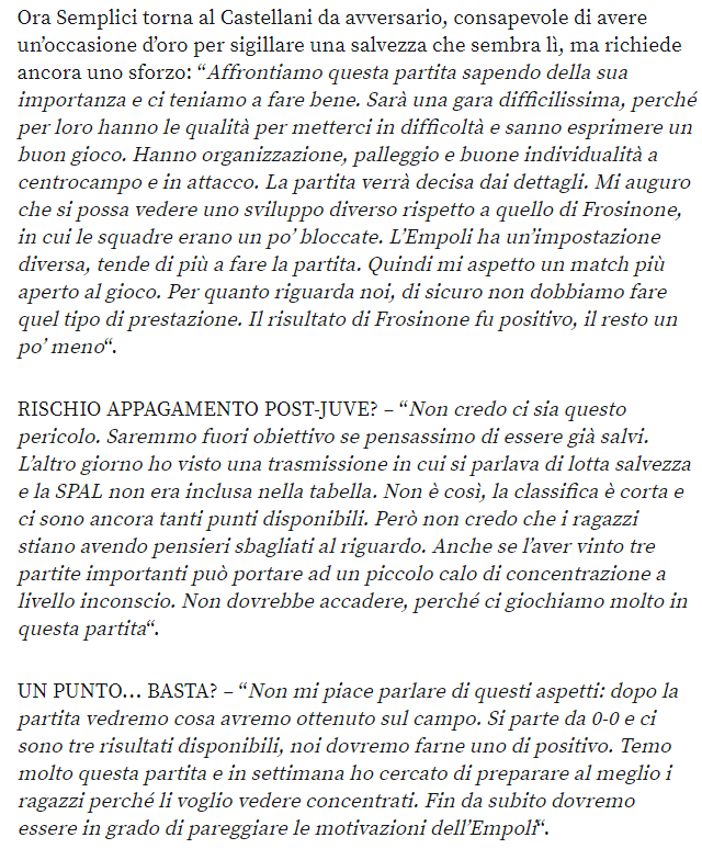 Home Empoli Da Ferrara… parla il tecnico Semplici Da Ferrara… parla il tecnico Semplici Di Redazione PianetaEmpoli - 19 Aprile 2019 3 Queste le parole del tecnico della Spal, Leonardo Semplici, alla vigilia della sfida che si giocherà domani al Castellani. Il pezzo è a cura dei colleghi de “lospallino.com” ARTICOLI CORRELATIALTRO DALL'AUTORE Empoli Empoli-Palermo: statistiche a confronto Empoli Mercato Azzurro | Si guarda ad un centrocampista d’esperienza Empoli Duccio Degli Innocenti racconta la sua storia con l’Empoli 3 Commenti Smettila di tingerti i capelli, falso! Risposta Davvero… Sembra Berlusca quando si era fatto trapiantare il parrucchino…. Risposta Non mi piace il suo gioco, ma lo rispetto come tecnico. Mai sopra le righe anche come persona. Risposta LASCIA UN COMMENTO Cancella la risposta Please enter your comment! Please enter your name here You have entered an incorrect email address! Please enter your email address here Save my name, email, and website in this browser for the next time I comment. Δ Le ultime fotogallery Empoli Galleria Serie B 2025/26 | Empoli – Bari Massimiliano Ciabattini - 29 Novembre 2025 2 Galleria Serie B 2025/26 | Avellino – Empoli 23 Novembre 2025 Galleria Serie B 2025/26 | Empoli – Catanzaro 8 Novembre 2025 Galleria Serie B 2025/26 | Virtus Entella – Empoli 1 Novembre 2025 Galleria Serie B 2025/26 | Empoli – Sampdoria 28 Ottobre 2025