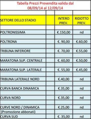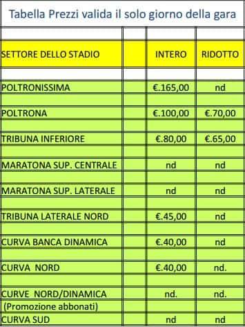 Nella tabella sotto andiamo a riepilogare i prezzi, sia della prevendita, sia del giorno della gara, ricordando che potranno acquistare il tagliando, per tutti i settori ad eccezione di quello riservato agli ospiti, i residenti in Toscana. Quindi, anche per rispondere ad alcune domande arrivate in redazione, chi non fosse residente in Toscana e non avesse sottoscritto l’abbonamento, non potrà assistere dal vivo all’incontro.