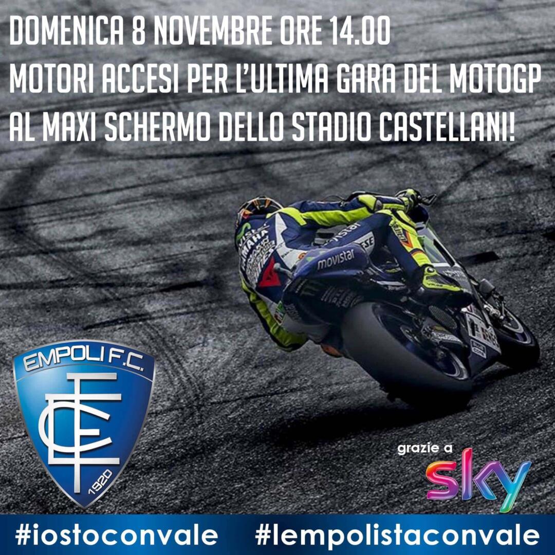 Domenica 8 Novembre, alle ore 14.00, grazie alla gentile concessione di Sky TV, sul maxi schermo dello Stadio Carlo Castellani, prima della gara Empoli-Juventus, sarà visibile in diretta l’ultima gara del mondiale MotoGP in programma a Valencia!