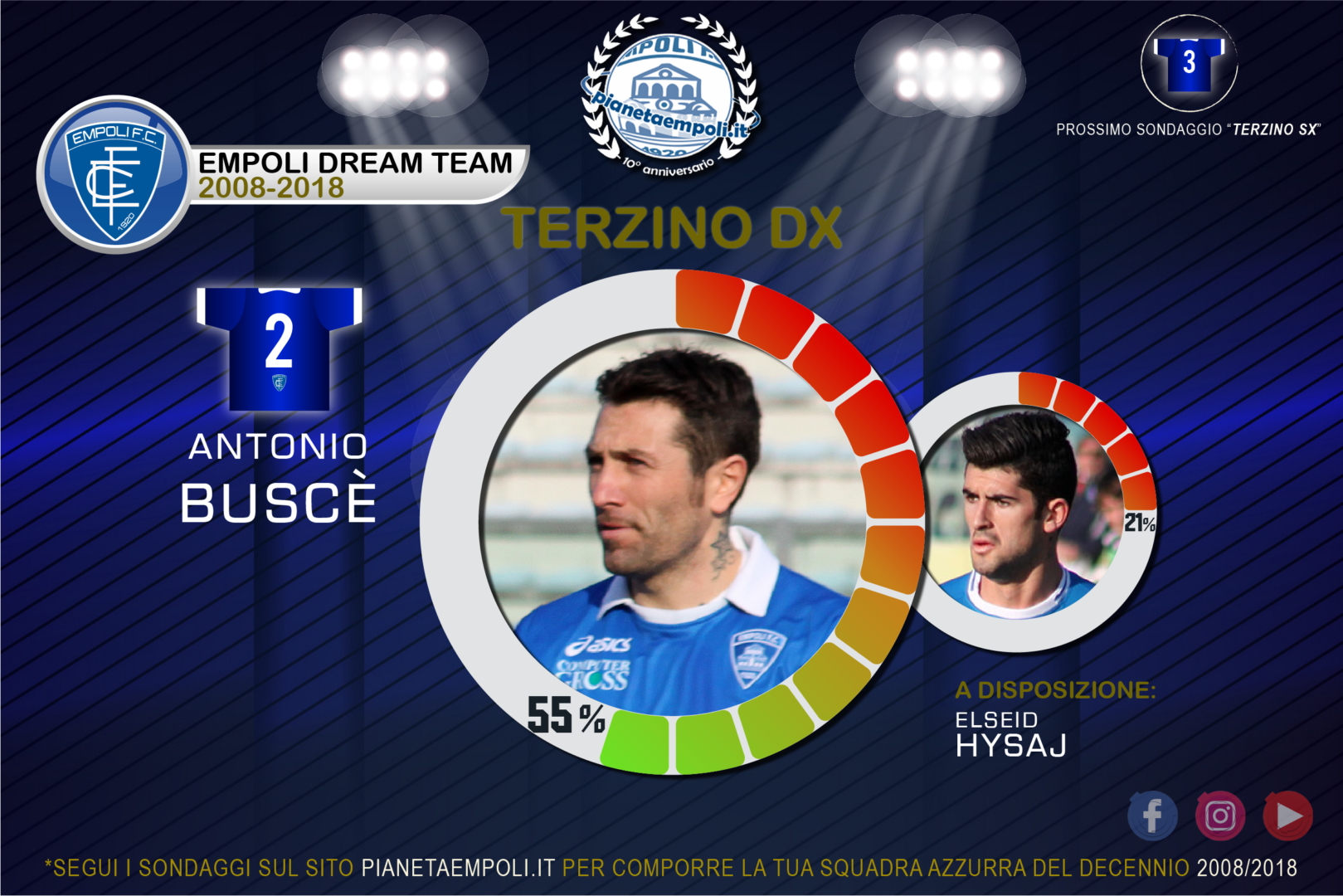 Comincia a prendere forma la squadra del decennio ed il primo nome da collocare lungo la corsia di destra è quello di Antonio Buscè che raccoglie il 55% dei voti.