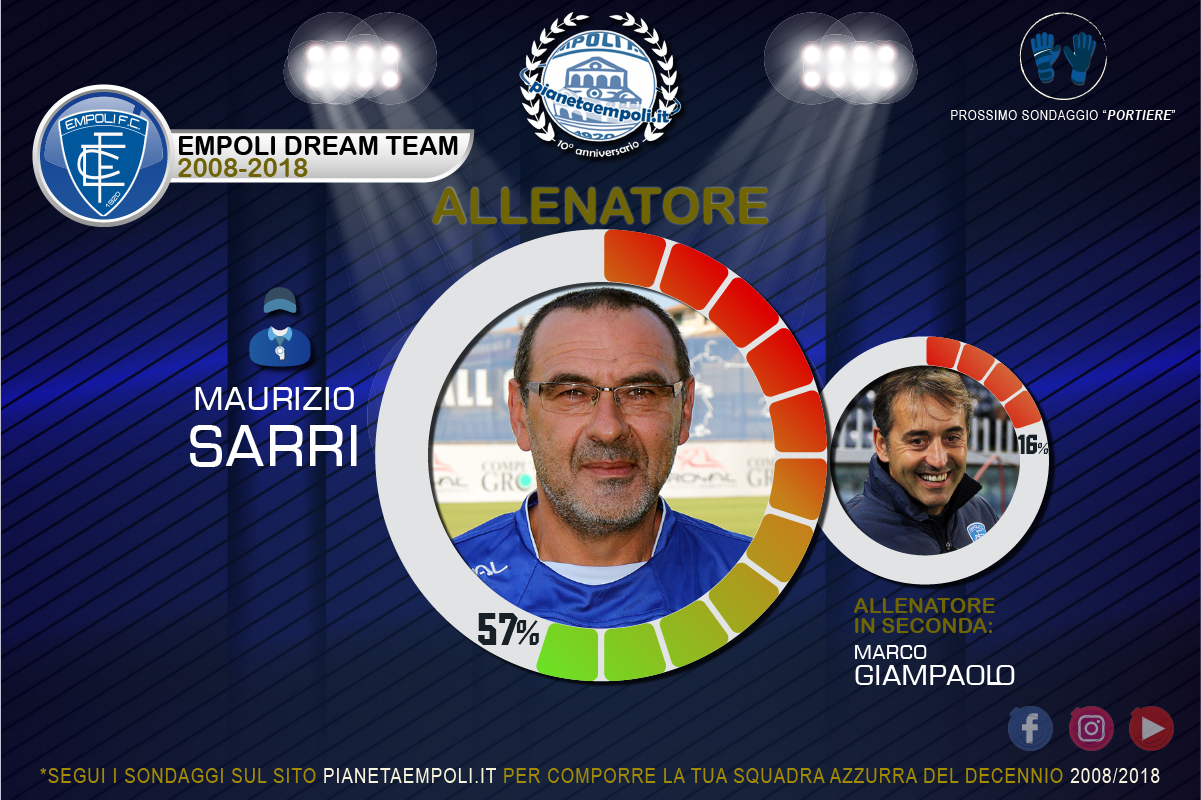 Un plebiscito incorona Maurizio Sarri “allenatore del decennio”, con i lettori di Pianetaempoli.it che hanno premiato l’attuale tecnico del Chelsea con il 57% delle preferenze. Nettamente staccati si collocano tutti gli inseguitori, a partire dal secondo classificato, Marco Giampaolo, campione di risultati in campo e signorilità fuori, che raccoglie il 16% dei consensi. Sul podio si colloca anche il mister più citato dai tifosi azzurri nei commenti degli ultimi mesi, Aurelio Andreazzoli, con il 14%. Menzione d’onore infine per Silvio Baldini che raggiunge il 7%, mentre gli altri colleghi sono costretti a dividersi le briciole con percentuali che vanno dal 2% (Giovanni Martusciello) all’1% (tutti gli altri).