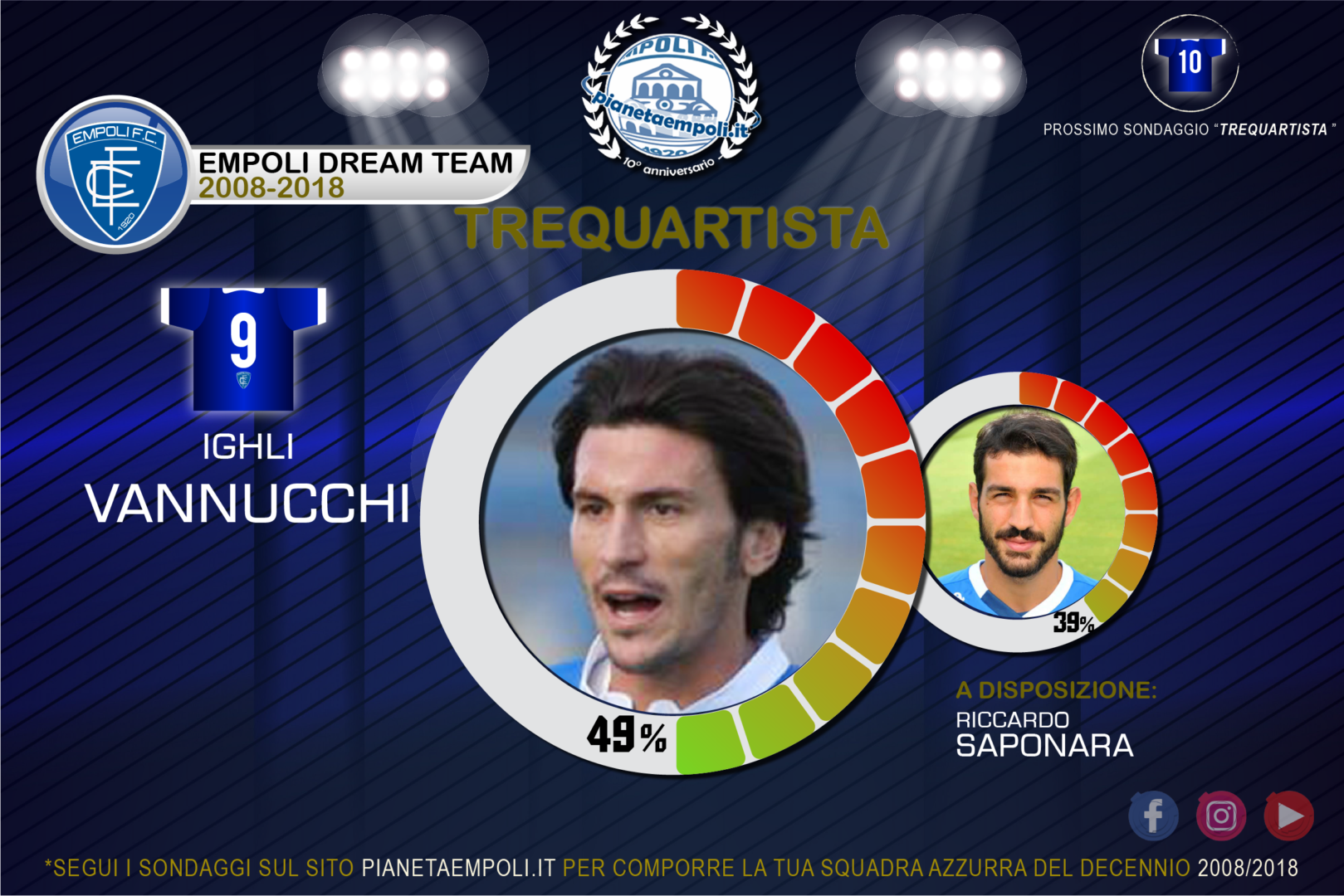Ighli Vannucchi in cabina di regia dell’attacco del Dream Team, questo il responso del migliaio di tifosi azzurri che ha espresso la propria preferenza portando in rosa anche Riccardo Saponara. Una votazione che fin da subito si è delineata come una corsa a due, praticamente senza concorrenza. Alla fine la spunta il capitano di mille battaglie che con il suo 49% precede il compagno di reparto che si ferma al 39%.