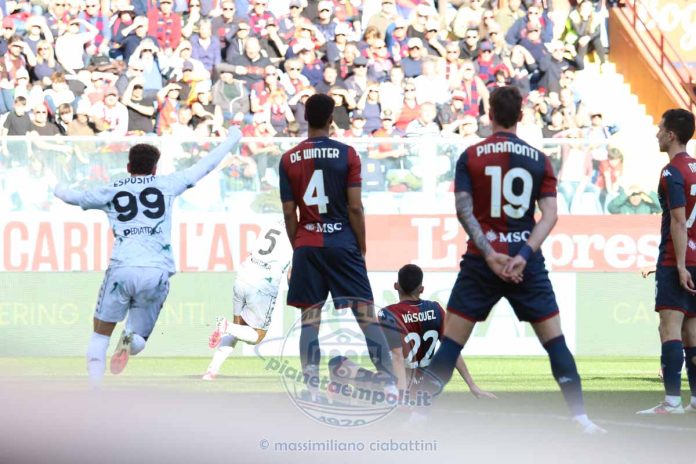 Rispetto alla gara di Coppa Italia D’Aversa si riaffida ai titolarissimi. E’ il Genoa a gestire maggiormente il gioco mentre l’Empoli cerca di pressare alto i rossoblù con l’intento di sfruttare eventuali errori in mezzo al campo. La prima vera occasione è proprio per gli azzurri al 16′, bel cross sul secondo palo di Pezzella per Gyasi, che in spaccata da pochi metri non trova lo specchio della porta. La gara non regala grosse emozioni fino al 36′, quando l’Empoli trova il vantaggio sul corner calciato da Pezzella verso l’area piccola, Leali smanaccia e pallone che finisce sul destro di Grassi che calcia con il piattone indisturbato trovando lo spazio giusto per battere il portiere dei liguri. Nell’intervallo D’Aversa decide di lasciare negli spogliatoi Colombo, già ammonito, per Kouamè. Il Genoa rientra in campo con grande determinazione, ma l’Empoli continua ad essere più pericoloso quando si affaccia in avanti, come al 50′, quando Maleh trova bene in area Pezzella, che invece di calciare in porta decide di rimettere in mezzo il pallone per Kouame, anticipato dall’intervento decisivo di Martin. Al 59′ l’Empoli va di nuovo a un passo dal raddoppio, con Esposito che si libera bene in area di rigore, ma al momento del tiro da pochi passi è miracoloso l’intervento di Vasquez, che si immola e di fatto compie una parata che salva il Genoa. Al 70′ è Cacace a provarci su calcio di punizione, la sue traiettoria sfiora l’incrocio dei pali ed esce di un soffio. La prima vera palla gol del Genoa arriva al minuto 76′, Cornet è bravo a bersi in area Pezzella e Maleh, ma poi col mancino calcia alle stelle. E’ l’ultima occasione degna di nota di una partita dal gusto amarissimo per l’Empoli, che rimane al terzultimo posto.