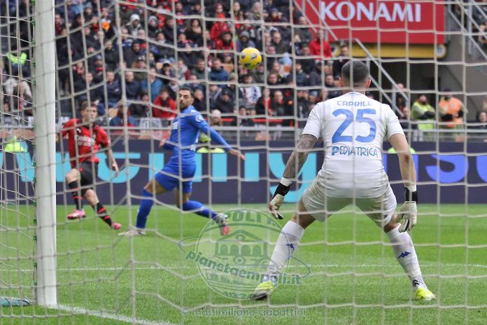 Gli azzurri tornano al 3-4-2-1 con Niang prima punta ed il ritorno in campo di Zurkowski e Gyasi. Marin è l’assente dell’ultimo minuto (già out Grassi) e quindi si punta su Fazzini. Al 5′ Pulisic va al tiro, Caprile è attento e si rifugia in angolo. Un minuto più tardi Bennacer prova a innescare Okafor ma il portiere azzurro è attento e sventa il pericolo in uscita. Premono i rossoneri alla ricerca del vantaggio: al 12′ anticipo provvidenziale di Ismajli su Okafor che era stato cercato da Pulisic. L’Empoli prova a farsi vedere su azione di rimessa, Maignan però è attento sul colpo di testa di Niang. Al 24′ giallo pesante per Fazzini che era diffidato e salterà la prossima partita col Bologna. Un minuto più tardi ammonito anche Rejinders per un intervento su Cambiaghi. Al 32′ tentativo di Okafor, Caprile va giù e para senza affanni. È il preludio al gol dei padroni di casa che arriva al 40′: Okafor riceve palla in profondità da Bennacer, poi mette al centro per l’accorrente Pulisic che calcia di prima intenzione col sinistro. Deviazione determinante di Luperto e palla alle spalle di Caprile. La rete, inizialmente annullata per posizione dubbia dello svizzero, viene poi convalidata dopo il check arbitrale. Doppia tegola per l’Empoli, che sull’azione dell’1-0 del Milan perde Ismajli per infortunio. Al posto dell’albanese, al 42′, fa il suo ingresso Bereszynski. Le squadre vanno al riposo dopo 3′ di recupero con i rossoneri in vantaggio di una rete. La ripresa ha inizio senza sostituzioni rispetto alle squadre che avevano chiuso il primo tempo. Al 48′ ci prova Calabria ma con un tiro che finisce alto rispetto alla porta difesa da Caprile. Doppio cambio per l’Empoli al 55′: dentro Cacace e Kovalenko per Fazini e Pezzella. Nicola passa al 4-3-3 che da più ampiezza al gioco. Al 56′ Maleh serve Cambiaghi il cui sinistro viene deviato in corner da Thiaw. Sul prosieguo dell’azione d’angolo ci prova Zurkowski ma il suo tiro non inquadra la porta. Minuto 62′, tripla sostituzione per i rossoneri: dentro Kalulu, Musah e Chukwueze per Tomori, Reijnders e Pulisic. Al 65′ opportunità per il raddoppio del Milan: Okafor va in campo aperto e allarga a destra per Chukwueze che si fa respingere il tiro in corner. Nel Milan al 72′ Giroud prende il posto di Jovic. Al 76′ Caprile devia in corner un tiro di Loftus-Cheek. Doppio cambio per Nicola: Cancellieri e destro prendono il posto di Zurkowski e Niang. Rischio per il Milan al 79′: Bereszynski approfitta di una leggerezza di Thiaw, e prova a cercare Destro all’altezza dell’area piccola, provvidenziale l’anticipo di Kalulu. All’83’ palo di Destro, ma l’ex della sfida era in fuorigioco. Gli azzurri provano l’assalto finale. Dopo un angolo procurato da Cacace, Destro va al tiro di testa ma appoggia debolmente verso Maignan. Durante i 4′ di recupero la squadra di Nicola non riesce a concretizzare l’assalto e torna a casa sconfitta per la seconda volta consecutiva.