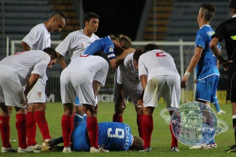 Nello scatto del nostro grande Max Ciabattini tutto lo sconforto di capitan Davide Moro, quando si rende conto dell’entità dell’infortunio di Coralli. Il capitano si è poi presentato in sala stampa e ai nostri microfoni ha espresso come tutto lo spogliatoio azzurro sia con il “Cobra”.