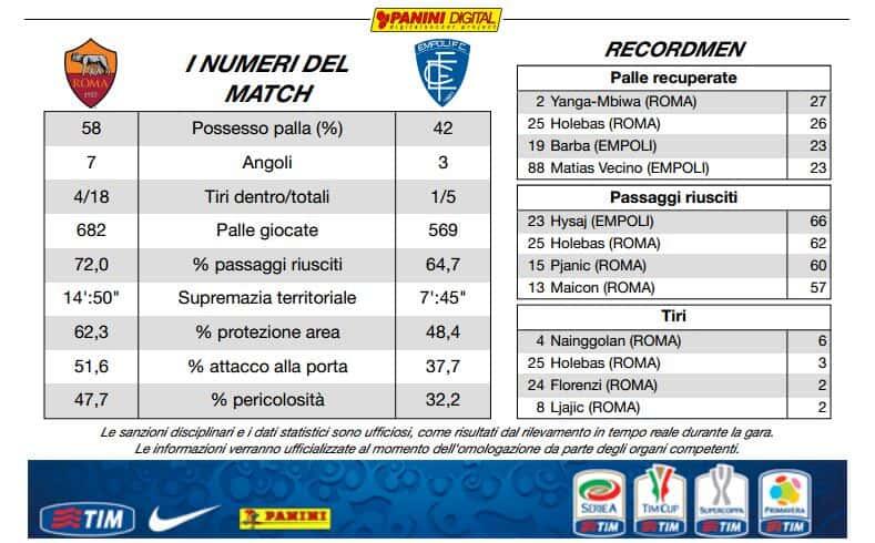 I numeri cosí come sono, non discuto, non sembrano rispecchiare la continuitá è la organicitá della nostra squadra che ha giocato bene anche per buona parte del secondo tempo, però un dato lascia perplesso: la casella TIRI. Impossibile vincere se non tiri in porta. Purtroppo non si tira ne in area ne fuori area.