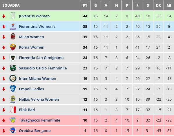 Se dovesse arrivare uno stop definitivo saranno diversi i punti da discutere, oltre all’assegnazione del titolo o meno alla Juventus capolista che andrebbe in Champions League assieme alla Fiorentina (pari punti con il Milan, ma con una migliore differenza reti). In Serie A bisognerà decidere se bloccare o meno le retrocessioni (al momento Orobica e Tavagnacco sarebbero in B), mentre in Serie B chi, oltre al Napoli, far promuovere in massima serie fra Lazio e San Marino con le prime che sono seconde con due punti di vantaggio sulle sanmarinesi, ma con una gara in più. Possibile che si decida di promuovere tutte e tre con la Serie A che diventerebbe così dispari – salvo mancate iscrizioni – con 15 (se ci sarà il blocco delle retrocessioni) o 13 squadre.