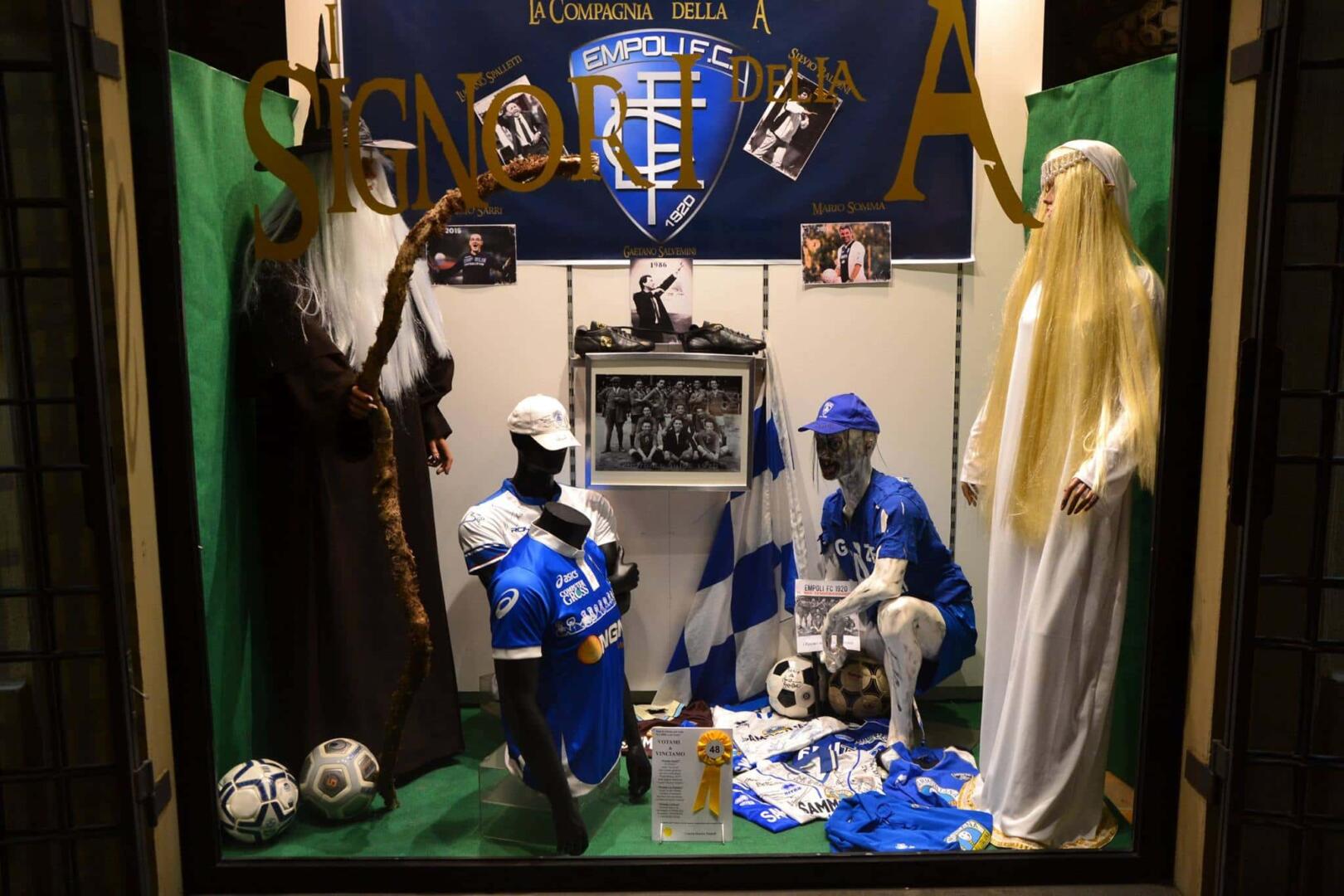 Quando la passione azzurra varca i confini delle fiabe. Così la vetrina dello storico negozio specializzato in abbigliamento sportivo Elio Sport, in pieno centro ad Empoli, diventa davvero particolare. Sul profilo facebook del negozio, ad accompagnare le foto della vetrina (alcune di queste ve le postiamo nella fotogallery di seguito, ndr), troviamo questo slogan:”I Signori della A (La Compagnia della A), la storia degli Allenatori che hanno portato in serie A l’ Empoli Fc, trasportata nel mondo del Signore degli Anelli… con Lo Stregone Gandalf (Stregone del Calcio), il geloso del suo Tesssooooorooooo Gollum (avido di tutte le maglie storiche), la Dama Galadriel nobile Elfa che veglia sullo stadio Castellani”.