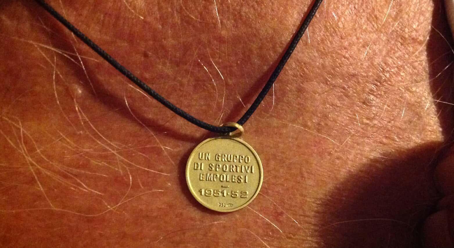Poi si sgancia i primi tre bottoni della camicia ed ecco che spunta fuori un oggetto d’oro su di una collanina legata al collo… “ecco vedi, è sempre qui… campionato 1951/52; si arrivò secondi dietro al Cagliari che andò in Serie B, ma quell’anno l’Empoli fece una grande impresa. La FIGC decise di tagliare i gironi di Serie C, solo la seconda e la terza rimanevano in terza divisione nazionale, le altre tutte giù. Sembrava un’impresa impossibile… agli altri, non all’Empoli…”.