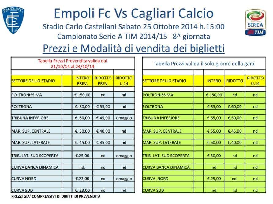L’Empoli FC comunica che i tagliandi per assistere alla gara Empoli – Cagliari, valida per l’ottava giornata di campionato ed in programma sabato 25 Ottobre, sono in vendita dalle ore 10:00 di oggi, martedi 21 Ottobre. I tagliandi saranno in vendita tramite il circuito Ticketone ad eccezione dei tagliandi di maratona superiore (centrale e laterale) in vendita solo all’Empoli Point e Centro di Coordinamento