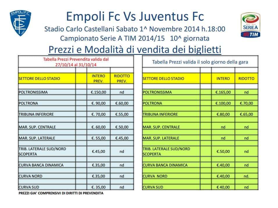 L’Empoli FC comunica che i tagliandi per assistere alla gara Empoli – Juventus, valida per la decima giornata di campionato ed in programma sabato 1 Novembre alle ore 18:00, sono in vendita dalle ore 15:30 di oggi, lunedi 27 Ottobre. I tagliandi saranno in vendita tramite il circuito Ticketone ad eccezione dei tagliandi di maratona superiore (centrale e laterale) in vendita solo all’Empoli Point e Centro di Coordinamento.