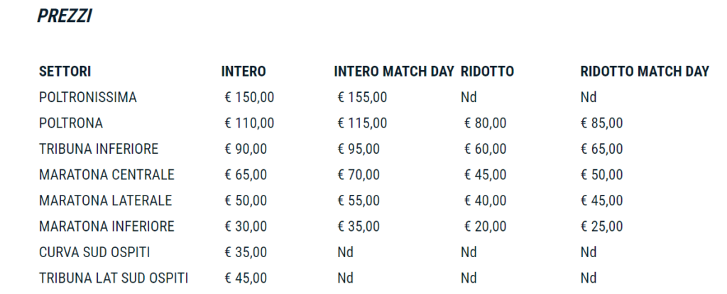1. Comunque 35 euro x la ferraglia e ben 45 per la laterale sud per lo stadio più brutto d’Europa mi sembra una vera follia. Meno male siamo di sinistra e si vede anche qui…..