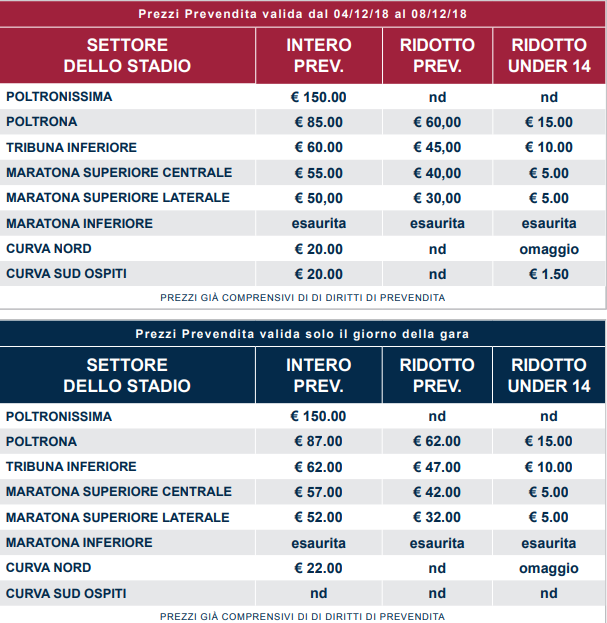 Il giorno della gara i tagliandi saranno acquistabili alle biglietterie dello stadio dalle ore 13:30