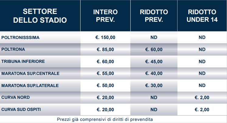 Il biglietto a tariffa “Ridotto” è valido per gli Over 60 (nati prima del 20-08-1958), Under 20 (nati dal 20/08/1998 al 19/08/2004) invalidi con un grado di invalidità superiore al 60% e donne. La tariffa “Under 14” è valida per i nati dal 20-08-2004. Per usufruire del biglietto “Under14” è necessario che una persona maggiorenne acquisti contestualmente un biglietto nel posto accanto a quello dell’Under 14 e ne garantisca la sorveglianza. I minori di 14 anni non possono accedere all’impianto se non accompagnati da un maggiorenne. L’acquisto dei biglietti tramite web è attivo con la sola modalità “Stampa a casa” attraverso il sito riconosciuto dall’Empoli Fc https://empolicalcio.vivaticket.it/index.php (si raccomanda di non acquistare i tagliandi in circuiti o canali web alternativi)