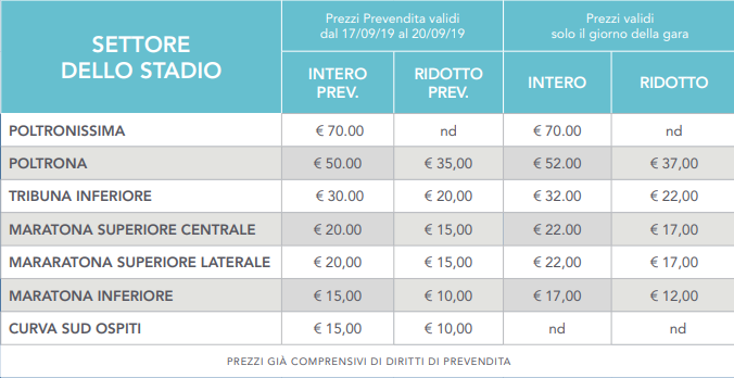 • Settore di Poltronissima, Poltrona, Tribuna Inferiore e Maratona Centrale: Biglietti disponibili su tutto il circuito VivaTicket e online con la modalità