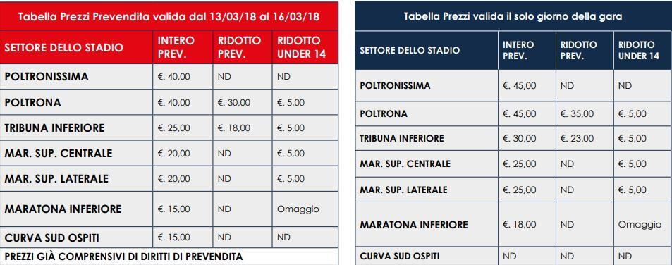 • La tariffa agevolata «Prevendita» è riservata a chi acquista il proprio biglietto entro il giorno 16 marzo. Acquistando il biglietto in «prevendita» si risparmia sul prezzo del biglietto e si evitano code ai botteghini e ritardi per l’accesso allo stadio. Il giorno della gara non sarà possibile acquistare il biglietto scontato «Prevendita».