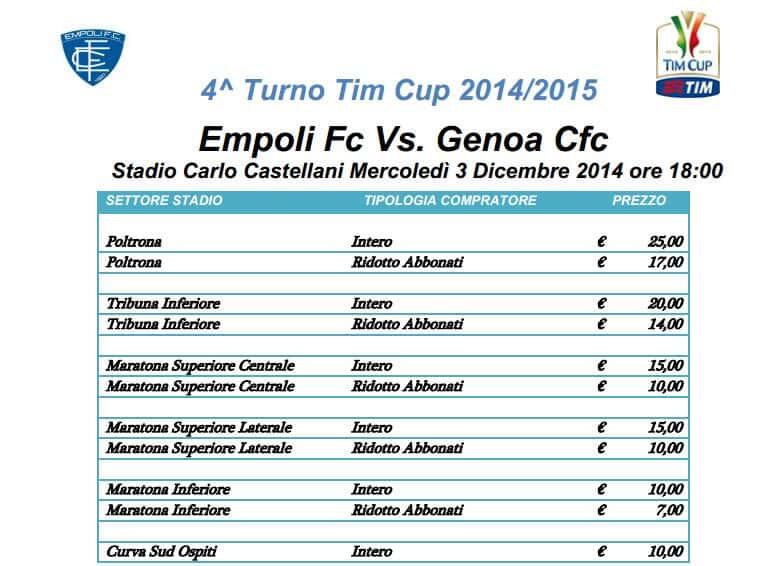 Si giocherà mercoledi 3 dicembre, alle ore 18:00, il quarto turno della Tim Cup. Al “Castellani” (campo invertito) sarà ospite il Genoa e la società azzurra ha diramato da poco i prezzi e le modalità di vendita dei tagliandi per assistere al match.