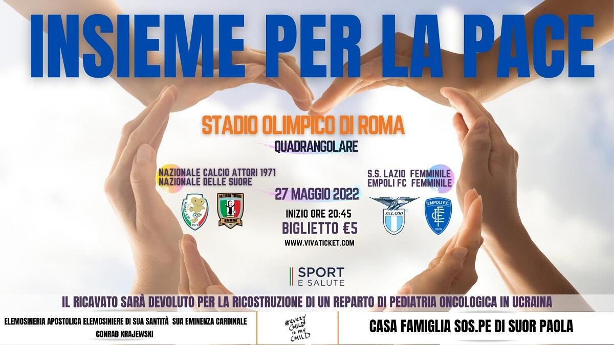 Il calcio scende in campo con “Insieme per la Pace”. Allo Stadio Olimpico di Roma, venerdì 27 maggio alle ore 20.45, andrà in scena un quadrangolare a scopo benefico con la partecipazione di Empoli Femminile, Lazio Women, Nazionale Calcio Attori 1971 e la Nazionale delle Suore. Una serata all’insegna di divertimento e spettacolo prima, dopo e durante la partita e all’insegna della solidarietà, con il ricavato che sarà devoluto in beneficenza per la ricostruzione di un reparto di Pediatria Oncologica in Ucraina.
