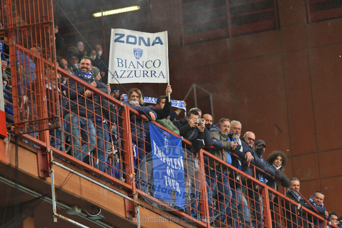 Il tifo sale d’intensità nei momenti immediatamente successivi ai due gol di Quagliarella, che timbra al 14° e al 29°, doppietta che fa salire questa vecchia volpe delle aree di rigore a quota 100 gol in Serie A, e che per lui è una liberazione essendo passati diversi mesi dall’ultima volta in cui ha segnato. Nella parte inferiore della Tribuna centrale, vicino al settore ospiti Sud, agisce un gruppo di Ultras, riconoscibile da una pezza, che, al triplice fischio finale, salta all’unisono con tutta la Sud al coro di “Chi non salta è un genoano”. I Distinti sono scarsamente riempiti, mentre la Gradinata Nord è semideserta. Nel settore ospiti sono sistemati circa 80 tifosi empolesi, riconoscibili dalla pezza, ovunque presente, “Empolesi on tour”, principalmente, e dallo stendardo “Zona Bianco Azzurra”. Purtroppo, con la capienza negli stadi ancora al 50%, sono assenti i gruppi Ultras della “Maratona Emiliano Del Rosso”, cioè chi garantisce il tifo azzurro, che oggi a Genova è praticamente inesistente. Purtroppo manca anche il gruppo di volenterosi che, almeno nelle uscite casalinghe, garantisce un buon tifo, infatti mancano i lanciacori abituali del gruppo, oggi assenti. Alcuni Ultras presenziano per i fatti loro, ci sono tante famiglie, e quindi il tifo è pressoché nullo. Comunque c’è da dire che dalla Gradinata Sud non parte nessun coro di scherno all’indirizzo del settore ospiti biancazzurro. La prossima settimana, contro la forte Juventus, finalmente, con la capienza al 75% o al 100%, rientreranno i gruppi Ultras empolesi che abitualmente presenziano in Maratona Inferiore, vale a dire i “Desperados”, gruppo principale, e gli altri gruppi minori, che garantiranno il giusto sostegno ai giocatori azzurri.