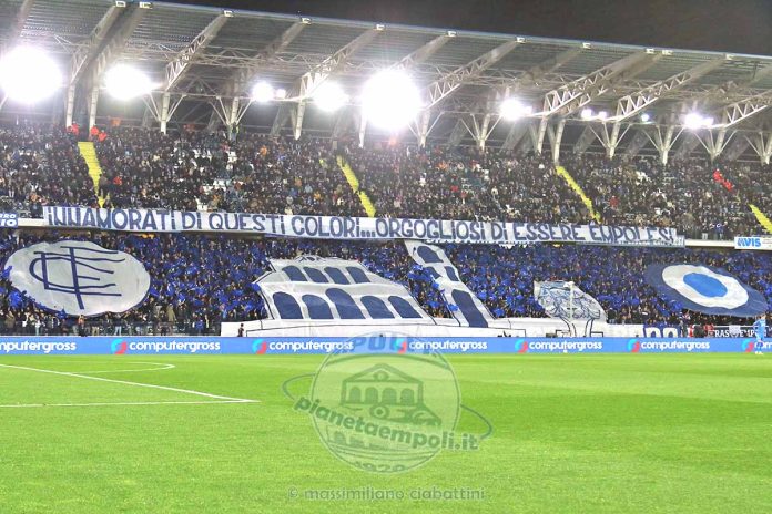 Stasera, vista la storica, irripetibile occasione, la Maratona “Emiliano Del Rosso”, oggi pienissima, almeno sotto, si fa bella, organizzando una grandiosa coreografia, rara a queste latitudini. Guardandola da sinistra verso destra, sullo sfondo di tantissime bandierine azzurre, si può ammirare, su un telone rotondo, lo stemma “EFC” con le lettere intrecciate, la facciata della chiesa della Collegiata, con accanto il campanile, anch’esse su teloni, la fontana di piazza Farinata degli Uberti, e il simbolo circolare della Coppa Italia biancazzurro, su teli, mentre al piano superiore della Maratona si può leggere l’eloquente striscione “Innamorati di questi colori…orgogliosi di essere empolesi”, il tutto per un impatto davvero bello. Il tifo azzurro inizia molto forte, con decibel alti. Si parte con “Alé forza azzurro alé, alé forza azzurro alé, alé forza azzurro alé, alé forza azzurro alé…”, per poi proseguire con “Alé alé ohoh, alé alé ohoh, e forza azzurro alé gli ultras son qui con te, lotta per vincere”, “Alé alé alé l’Empoli alé…”: tanti cori con pochissime pause. I primi minuti vedono la Maratona davvero in fibrillazione con un tifo assordante, che canta “Quando l’azzurro segnerà la Maratona esploderà in un boato che farà tremar la terra e il mar”, oltre a “…Empoli calcio…” ed “Empoli alé alé canto solo per te, sempre ti sosterrò e mai ti lascerò”. Gli ultras vedono subire le due reti del Bologna nel giro di pochi minuti, ed è una brutta botta per il popolo azzurro. La gente ora canta meno, seguono alcuni “Forza ragazzi”, poi “Siamo sempre al tuo fianco io di te non mi stanco, sei la cosa più bella che c’è…”. Verso fine primo tempo vengono intonati “Noi siamo gli empolesi con l’Empoli nel cuor” e “Che bella vita è vivere insieme a te, questa è una malattia che non va più via…”. L’Empoli va sotto 0-3 ma la Maratona sembra stasera più in forma di molte altre volte. Tra i primi cori del secondo tempo c’è spazio anche per “Siam sempre qui insieme a te per l’Empoli combatterem”. Poi i doverosi, immancabili cori per i diffidati. Viene esposto lo striscione “Bagna nel cuore”, dedicato a Matteo Bagnaresi, ultrà del Parma, fraterni gemellati con quelli empolesi, scomparso il 30 marzo 2008, investito da un pullman di tifosi juventini diretti a Torino per assistere ad un Juve-Parma, nell’Area di servizio Crocetta, vicino Asti. Viene cantato immancabilmente il coro “Curva Nord Matteo Bagnaresi!”. Presenti una 15ina di esponenti dei gemellati di Montevarchi e 5/6 gemellati di Locorotondo. Verso la fine si canta “E’ la mia vita è, per sempre insieme a te…ovunque andrai non ti lascerò mai…”. Poco prima della fine viene eseguita una bella sciarpata, sul coro “Alé forza azzurro alé…alé forza azzurro alé…alé forza azzurro alé…alé forza azzurro alé”. La partita si chiude con il Bologna che vince nettamente e che non lascia spazio a scusanti. Anche oggi i giocatori empolesi ricevono applausi dalla Maratona azzurra: è troppo il divario tecnico tra le due squadre. Oggi non c’è stata partita ma da domenica prossima la squadra è chiamata a vincere, altrimenti sono guai seri, e la pazienza andrà esaurendosi. Il livello del tifo azzurro è da considerarsi molto buono. Voto: 8+.