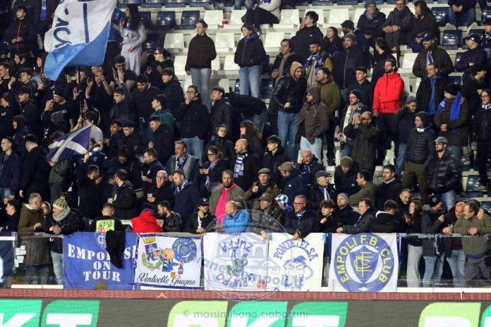 Anche oggi purtroppo la Maratona “Emiliano Del Rosso” presenta alcuni vuoti di troppo, proprio in quello che dovrebbe essere il cuore del tifo. Questi giorni e questi orari certo non aiutano, non invogliando la gente ad andare allo stadio ma a scoraggiarla. Sembra una grande presa in giro quella di voler riportare le famiglie allo stadio a queste condizioni, con questa collocazione dei match. I reduci da Palermo, nonostante i due incontri ravvicinati, hanno ancora la voglia di tifare. Si parte con “Alé alé ohoh, alé alé ohoh, e forza azzurro alé gli ultrà son qui con te lotta per vincere”, che spesso “apre” il tifo, proseguendo con tanti altri bei cori come “E quando in campo scenderai noi non ti lasceremo mai…questo è un canto d’amor che ci viene dal cuor…”, che fa da sottofondo al gol dell’Empoli. Poco dopo è il momento di “Siamo l’armata biancazzurra e mai nessun ci fermerà, noi saremo sempre qua quando l’Empoli giocherà…” e del “Biancazzurri olé”. Si cerca di proporre un po’ tutto il repertorio dei cori in questo momento favorevole per i padroni di casa. Più tardi è il momento dei cori per i diffidati, come “Diffidati sempre presenti!”, “Diffidati con noi!”, poi viene proposto il nuovo “E i diffidati intanto tornano tornano tornano…”. Viene riservato il bel coro “Bentornato diffidato, bentornato diffidato”, ad un noto esponente dei “Desperados Empoli” che proprio oggi è al rientro dal Daspo. E’ il momento anche del coro “Alé forza azzurro alé, alé forza azzurro alé…”. L’Empoli torna in campo svagato nel secondo tempo, prende due gol nel giro di poco tempo e la Maratona ne risente, accusando il colpo. Poi ritorna a tifare con “Forza azzurro alé alé, non mollare sai perché, quando in campo scenderai non ti lasceremo mai, lotta e vinci insieme a noi…”, “Siam sempre qui insieme a te per l’Empoli combatterem…”, “Lotta con il cuor fino al novantesimo, è per questo che ti chiedo forza azzurro facci un gol, e forza azzurro Empoli ti ama, tutta la settimana io penso solo a te, Empoli calcio unico grande amore ti porto nel mio cuore e canterò per te…”. Nel finale si eseguono anche, prima che finisca l’incontro, “Siamo sempre al tuo fianco io di te non mi stanco…” ed “E facci un gol…e forza l’azzurro facci un gol…”, un coro che sa un po’ di preghiera e un po’ di disperazione. Al triplice fischio dell’arbitro, il sicuro signor Crezzini di Siena, piovono tanti sonori fischi dagli spalti dello stadio. Davvero pochi gli applausi, che, guarda caso, partono solo dal cuore del settore ultras, che prova a coprire il dissenso della gente empolese col coro “E nel fine settimana te lo canto con passion…già non vedo l’ora di ritornare in Maratona dove c’è più calor…e resterò per sempre qui a cantare sempre con il cuore sempre con te sarò…”. Non tardano ad arrivare polemiche, anche roventi, tra chi fischia e chi vorrebbe ancora incitare la squadra. Gli ultras pretenderebbero che chi sta dietro i loro striscioni non dovesse fischiare. Da segnalare la presenza di ragazzi gemellati di Montevarchi e di Locorotondo, amicizia nata da poco grazie al loro gemellaggio coi fasanesi, “fratelli” degli empolesi. Il livello del tifo empolese è stasera da considerarsi piuttosto buono. Voto: 7+.