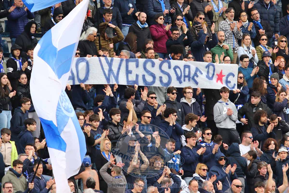 Il tifo della Maratona “Emiliano Del Rosso” parte con cori diversi dal solito, tipo “Noi ti amiamo e ti adoriamo non ti lasceremo mai…” e “Quando l’azzurro segnerà la Maratona esploderà in un boato che farà tremar la terra e il mar…”. Gli undici del nuovo mister Fabio Caserta si ritrovano presto in svantaggio, cosicché viene alzato puntuale il coro “Forza ragazzi!”, ed altri come “Siam sempre qui insieme a te per l’Empoli combatterem…”. Il sostegno ai colori biancazzurri però è più altalenante di molte altre volte e, specie sullo 0-2, meno incisivo del solito. Diverse sono le pause. Per una volta però è l’Empoli che dà la “sveglia” alla Maratona Inferiore e non la Maratona che la dà all’Empoli, quando Stiven Shpendi segna il gol dell’1-2 che accorcia le distanze. Succede anche ciò in questa strana e balorda stagione di Serie B degli azzurri. Si tifa con cori più convinti come “Alé alé ohoh, alé alé ohoh, e forza azzurro alé gli ultrà son qui con te lotta per vincere…”. Viene alzato anche il “Forza Azzurro! Vinci per noi!”, ma non viene molto bene. E’ sul 2-2 che davvero la Maratona carica e ci crede. Tra gli ultimi cori “E’ la mia vita è per sempre insieme a te…” e “…Empoli Calcio…”. C’è il tempo anche per mandare a quel paese i pratesi insieme ai dirimpettai dopo che il signor Marcenaro di Genova ha decretato la fine delle ostilità, con i tifosi empolesi che trasformano in applausi d’incoraggiamento i sonori fischi di fine primo tempo. Durante la partita esposto lo striscione “Ciao Wess P.a.e.” a firma “Desperados Empoli”. Facendo un passo indietro, nella trasferta sfortunata di Catanzaro dello scorso 8 marzo, esposti gli striscioni “Peppino è qua e canta con gli ultrà”, a circa un anno dalla tragica scomparsa di Roberto Maestrelli, alias “Peppino”, e “Forza Nicola siamo con te”, per un ultrà in difficoltà. Il livello del tifo empolese di oggi è stato abbastanza buono. Voto: 7-.