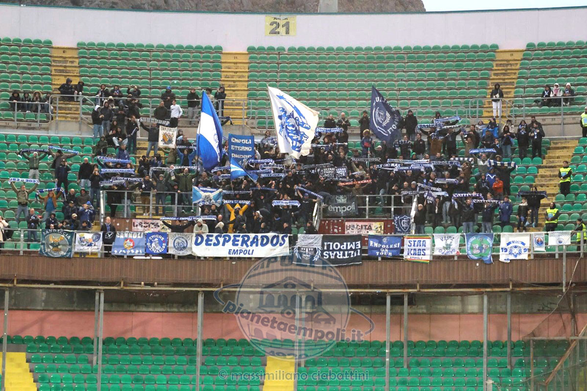 Sono davvero tantissimi, esattamente ben 266, i tifosi empolesi che raggiungono la Sicilia. Un numero sbalorditivo considerando la trasferta lontanissima e disagevole sul piano logistico, la classifica certo non esaltante e il bacino d’utenza ristretto di Empoli. Per un colpo d’occhio del settore ospiti, colorato da tante bandierine, bandieroni e pezze, davvero notevole. Il tifo parte bene, si sente nitido nella bolgia del “Barbera” il coro “Empoli! Empoli!”, poi grande