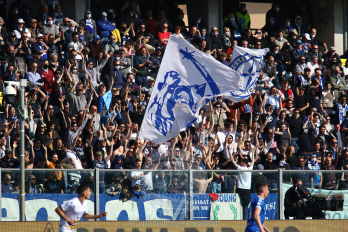 Match che si gioca quando dovrebbero giocarsi tutte le partite, di tutti i campionati, come una volta, cioè di domenica alle 15. Oggi è il 20 marzo 2022 e al “Carlo Castellani” si respira aria di primavera, anche se con un vento fastidioso. Si gioca per la 30esima giornata, dodicesima di ritorno, del campionato di calcio di Serie A 2021/22 e l’affluenza allo stadio non è delle più numerose, con 5.445 unità come dato ufficiale degli spettatori tra paganti e abbonati (2.858). La lunga striscia negativa – solo pareggi e sconfitte – della squadra azzurra, che non vince dal 12 dicembre 2021, 17esima giornata, 0-1 a Napoli, tiene lontano il grande pubblico e – forse anche per questo motivo – il tifo della Maratona non sarà dei migliori, o comunque non il solito, perché la gente empolese sembra sfiduciata, come sdegnata. Comunque il tifo dei gruppi Ultras della “Maratona Emiliano Del Rosso”, parte piuttosto bene, e prosegue con numerosi cori di incitamento, anche se nessuno di questi raggiunge picchi elevati, fino al 26°, quando Di Francesco combina con Pinamonti e trafigge il portiere del Verona Montipò, e solo allora gli Ultras azzurri faranno partire cori potenti, con Pinamonti che si rivolge alla Maratona e fa ampi chiari segni, arringando energicamente il pubblico, segno evidente che fino ad allora il tifo non era stato incisivo.
