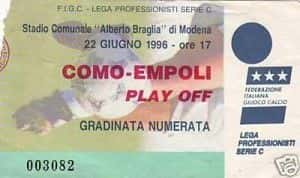 Finalmente, e siamo alla stagione 1995/96, si tornò a spareggiare per poter salire di categoria. Eravamo ancora in C1 e gli azzurri andarono a fare i playoff come seconda squadra meglio piazzata delle quattro. La semifinale, disputata in due gare, ci vide opposti al Monza, squadra regolata da un doppio 1-0. In Lombardia segno Esposito mentre nel match casaligo la rete portò la firma di Dal Moro. L’Empoli si qualificò quindi per la finale che ha sopresa vide il Como e non la Spal. In molti ricorderanno ancora quel 22 Giugno 1996. Ed in molti avranno anche fermato l’orologio alle 17,39 quando al minuto 84 del match Carmine Esposito segnò il gol che portò l’Empoli in serie B.